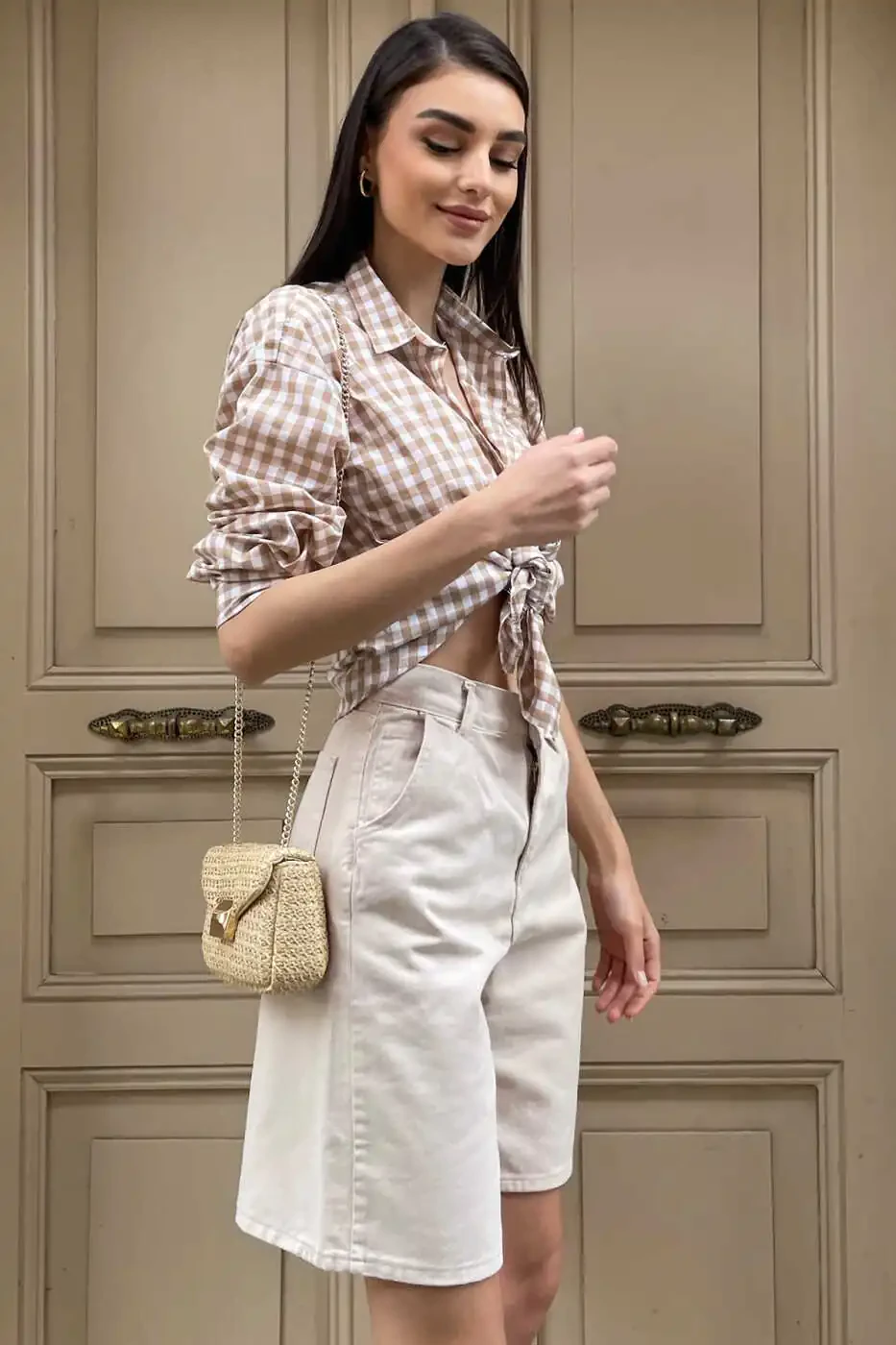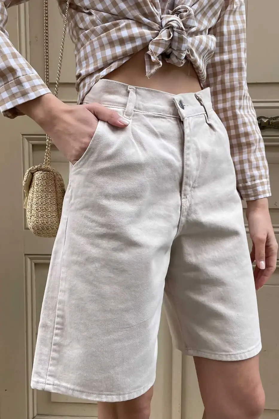 Combining style and comfort, the Women's Beige High Waisted Wide Leg Bermuda Denim Shorts ALC-X8174 are ready to become your new wardrobe favorite! With a slightly loose fit and high waist, it perfectly complements every body type. The beige color provides a chic and modern look that suits every style.