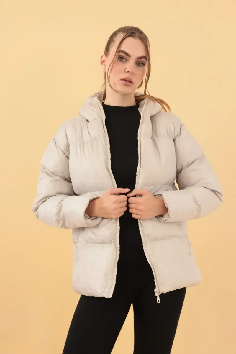 The Women's Beige Hooded Puffer Jacket is an excellent choice that offers both comfort and style in cold weather. This jacket is made of durable materials that provide superior protection against external factors. Its inner filling traps your body heat, keeping you warm and minimizing discomfort caused by the cold. The timeless elegance of beige offers the ability to be easily combined with any of your clothes. Whether for daily use or for special occasions, it helps you achieve a stylish look at all times. The hooded design provides extra comfort by protecting your head and neck in windy and rainy weather. Thanks to the adjustable feature of the hood, you can adjust it to your personal preference according to the weather conditions. The modern cut of the jacket gently emphasizes your body lines, creating a stylish silhouette. The zippered front closure provides easy putting on and taking off, while also preventing cold air from entering. Its pockets allow you to safely carry your belongings and offer an ideal area to warm your hands. The Women's Beige Hooded Puffer Jacket is a candidate to be an indispensable part of the winter months with both its warming structure and its stylish design. It is an ideal choice for women who do not want to compromise on their style in cold weather. This jacket prioritizes not only your appearance but also your comfort. It allows you to feel comfortable and stylish at all times, whether in your daily activities or at special events. With this jacket, which will be one of the most favorite pieces of your wardrobe, stay warm in winter and show off your style. The neutral tone of beige easily matches your clothes in different colors and patterns, offering you endless combination possibilities. This jacket is not just a garment, but also a style statement. Challenge the cold weather with the Women's Beige Hooded Puffer Jacket and enjoy being stylish and comfortable at all times.
