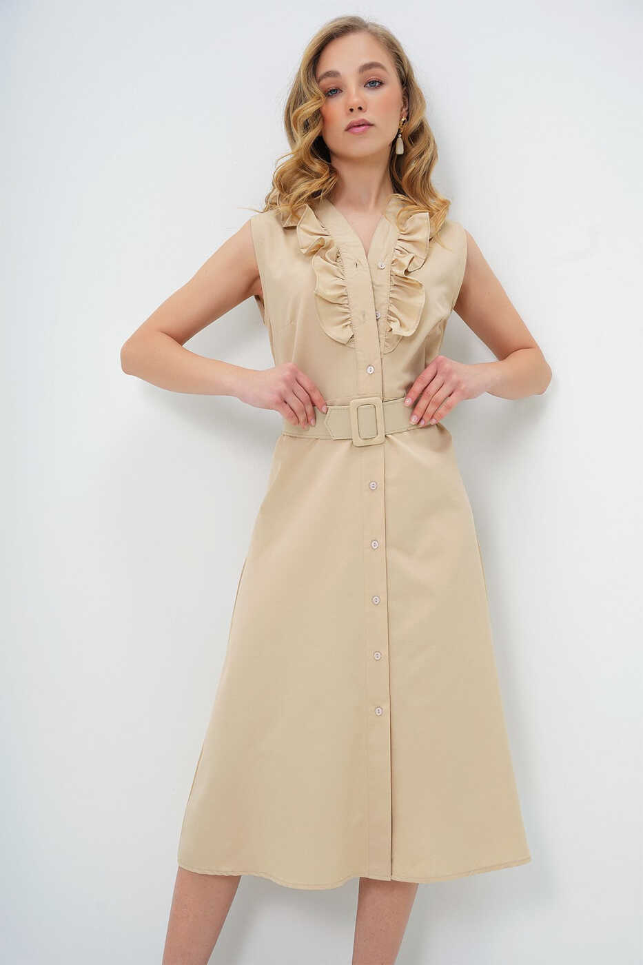 This dress, which combines elegance and comfort, is destined to become an indispensable part of your wardrobe. The beige color adapts to every style, and the ruffles on the front add a feminine touch. The belt detail accentuates your waist, adding a graceful touch to your silhouette. The breathable structure of the poplin woven fabric keeps you cool and comfortable in the summer months.