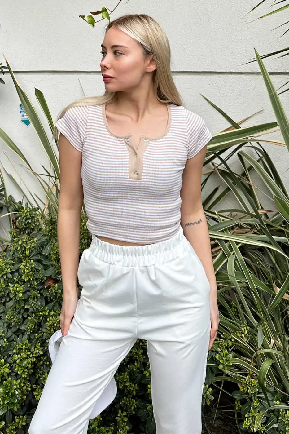 Combining style and comfort, the Women's Beige Button-Up Striped Crop Knit Blouse is set to become an indispensable part of your wardrobe. This blouse offers a modern look with its beige color and elegant stripes, allowing you to create various combinations. Made from lightweight and breathable knit fabric, the blouse provides comfortable use throughout the day. The button closure on the front offers both style and ease of use. The crop cut emphasizes your waist, adding a feminine touch to your silhouette.