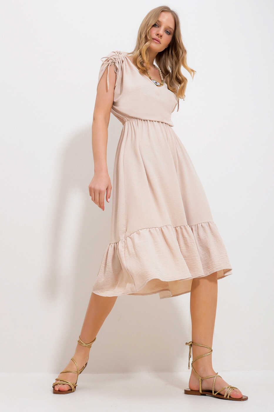 Made from woven fabric, the dress offers comfortable use throughout the day with its breathable structure. Its beige color is compatible with every skin tone, allowing you to create different combinations.