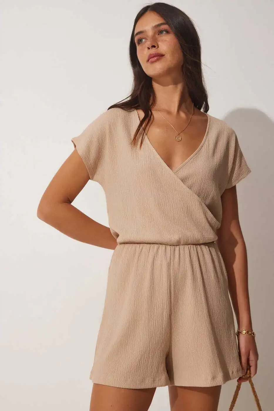 Women's Biscuit Envelope Neck Short Knitted Jumpsuit UB00019, combining comfort and elegance, will be one of the indispensable pieces of the summer months. Thanks to its flexible fabric made of 90% polyester and 10% elastane blend, it offers comfortable use throughout the day. Its mini length creates a young and dynamic look, while the envelope neck and crossover silhouette add a modern and trendy feel. The biscuit color, compatible with any combination, is a candidate to be the savior piece of your wardrobe. The elasticated waist detail provides both a comfortable fit and a feminine silhouette by making your waist look thinner. The shorts design offers freedom of movement, while the short sleeve length helps you stay cool in the summer heat. With its plain pattern and simple elegance, this jumpsuit, which adapts to every environment, can be preferred in a wide range from daily use to special invitations. The wide leg design adds a modern touch while providing comfort. The woven structure of its fabric increases its durability, offering long-term use. It can be easily cleaned and requires no maintenance according to the Type 1 washing instructions. This jumpsuit, which you can have with the assurance of Trendyol, will help you make a difference with your style. With the simplicity and elegance of the Basic collection, this jumpsuit, a timeless piece, is a must-have in every woman's wardrobe.
