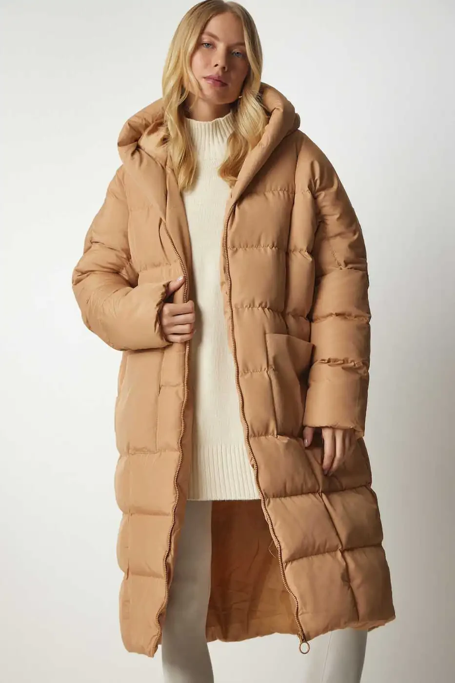 Women's Biscuit Hooded Oversized Long Puffer Coat NT00428 is the perfect choice for women who want to look stylish and stay warm in cold weather. This coat, which easily adapts to any environment with its simple and elegant design, will be an indispensable part of your wardrobe with its plain pattern and biscuit color. Ideal for daily use, this coat offers comfort and functionality together. You can safely carry your belongings thanks to its double-pocket design, and you can protect your head from the cold with its hooded collar type. Its long-sleeved design keeps your arms fully warm, while its polyester filling material provides high thermal insulation. In this way, you will not compromise on your comfort even in the coldest weather. The inflatable fabric structure, which attracts attention with its casual style and comfortable silhouette, ensures that the coat gains a modern and trendy look. The long cut offers both elegance and protection. The lined structure provides extra comfort and warmth, while the standard sleeve type does not restrict your freedom of movement. The zippered closure type allows for practical use and allows you to put it on and take it off easily. This coat, which promises durability and long-term use with its thick woven fabric, offers comfortable use thanks to its oversized fit. This coat not only offers a stylish look, but also stands out with its functional features. It is an ideal choice for women who want to be protected from the cold, move comfortably and look stylish. This coat, which will complement your combinations both in daily use and on special occasions, will be one of the most popular pieces of your wardrobe. Moreover, you can use it for many years thanks to its high-quality materials. Get this stylish and useful coat now and stay warm without sacrificing your style in cold weather! This special design coat, offered with Trendyol assurance, is both budget-friendly and an option that will meet your expectations. Don't miss it, refresh your wardrobe!