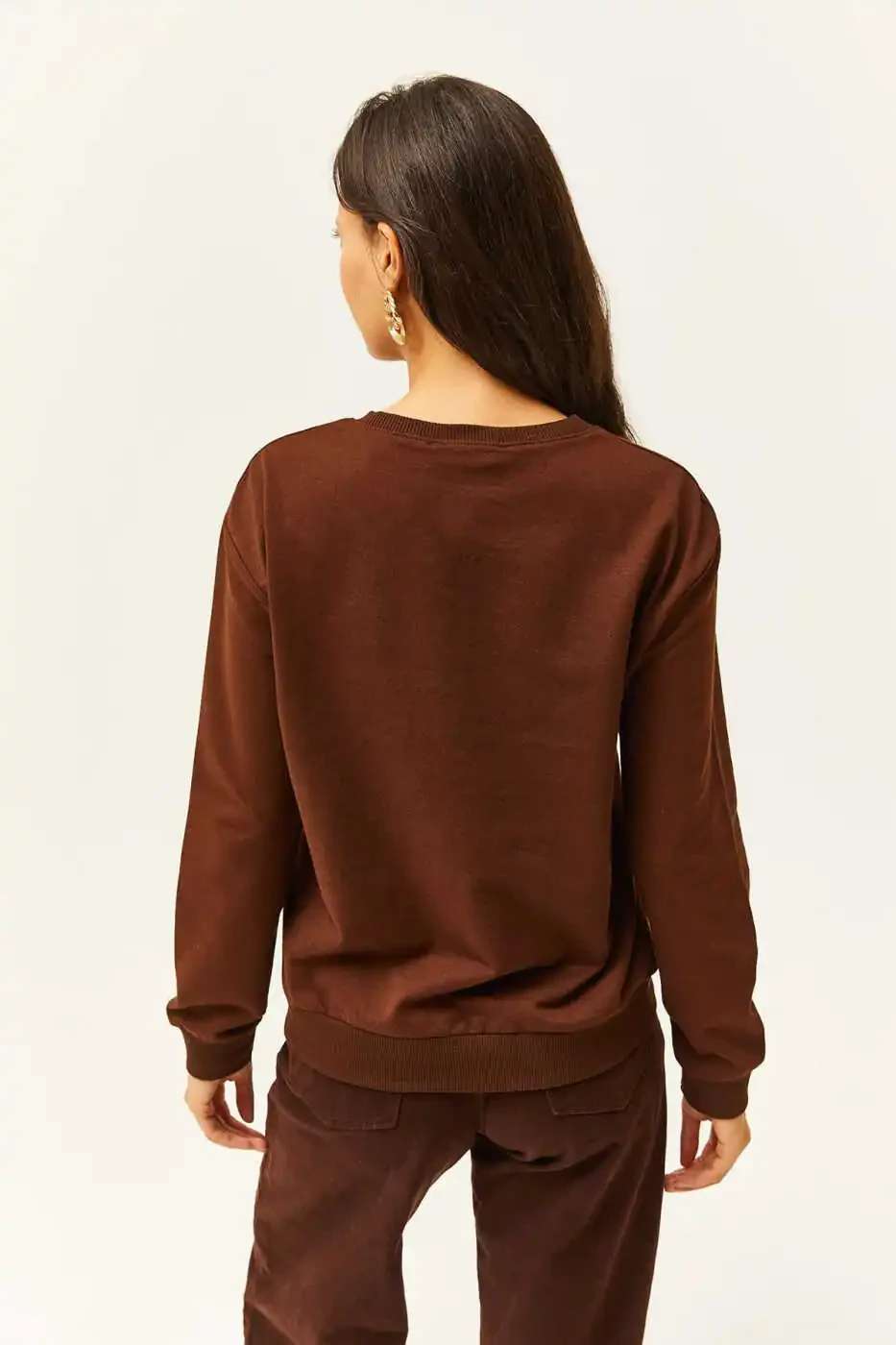 This stylish seasonal sweatshirt stands out with its soft and comfortable texture. The bitter coffee color and eye embroidery offer a simple yet striking look. The blend of 70% cotton and 30% polyester provides breathability and durability. With a height of 58 cm and a chest measurement of 53 cm, it fits a standard body type. You can choose the most suitable size by paying attention to the measurements of our model, who wears a size S/36/1.