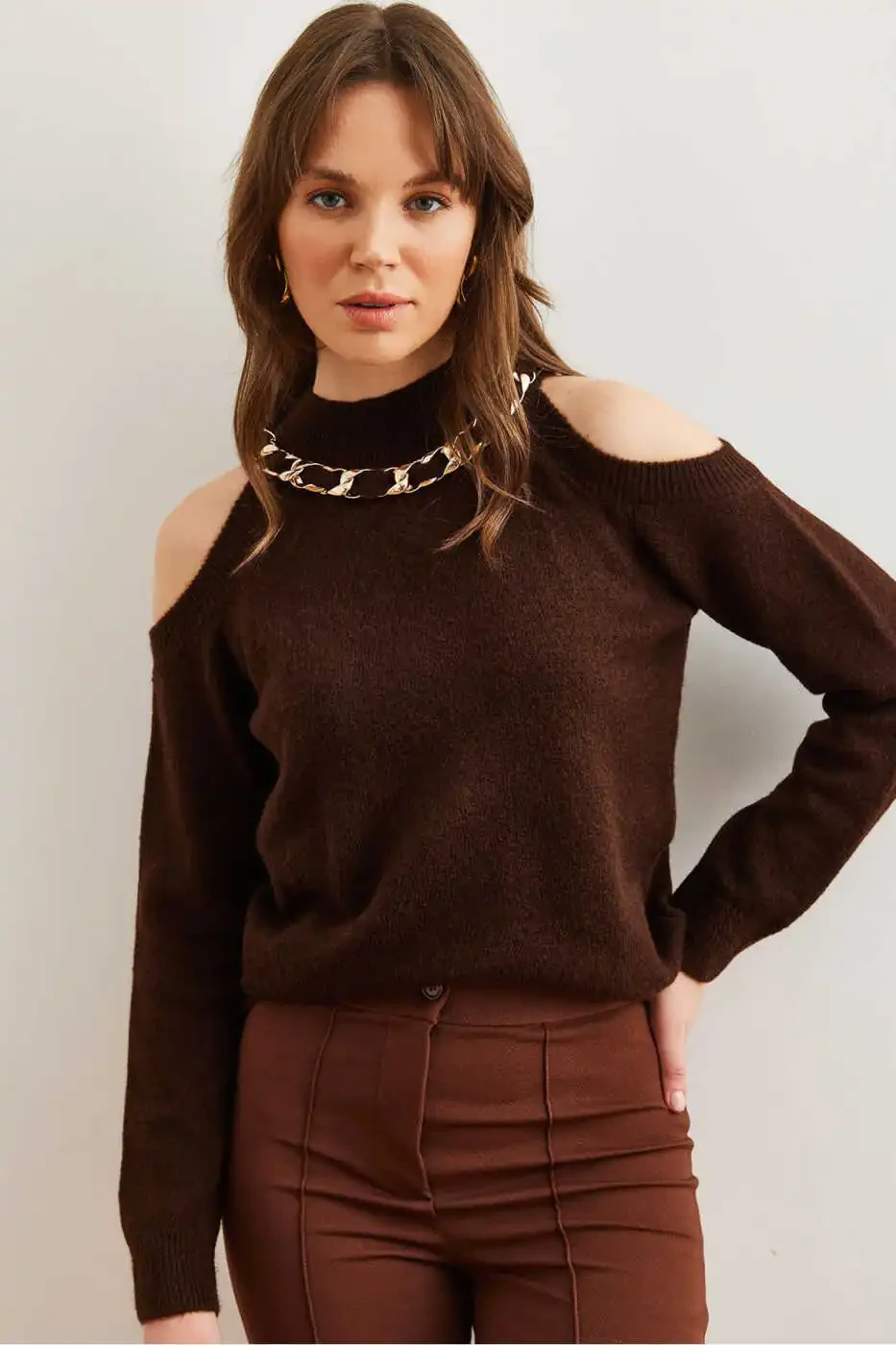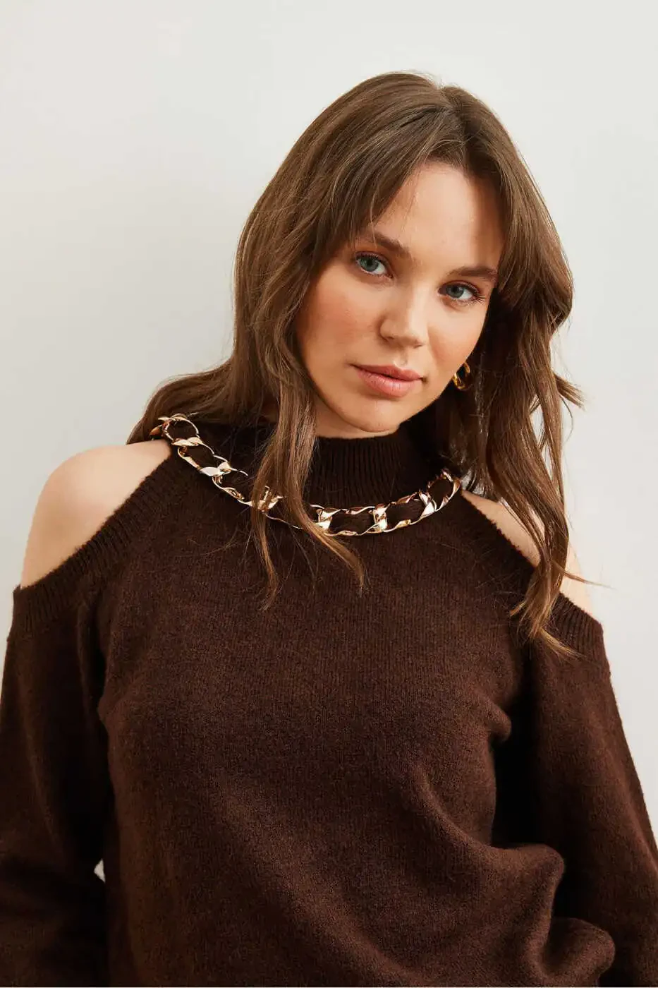 **Women's Bitter Coffee Thick Chain Detailed Soft Textured Knitted Sweater KZK-19000877**Shipped by **Trendyol -Olalook**, this women's knitted sweater impresses with its stylish bitter coffee color and thick chain details. Made of soft materials, including 70% acrylic, 20% polyester, and 10% elastane, this sweater is comfortable enough to wear all day long.**Size Information:*** Length/Chest: 52/50 cm**Model Measurements:*** Height: 1.73* Bust: 85* Waist: 63* Hips: 90**Size Worn by the Model:*** S/M**Please Note:*** Colors may vary slightly due to lighting differences in studio photography.* Free returns within 15 days.* Orders exceeding 10 units may be canceled by Trendyol.