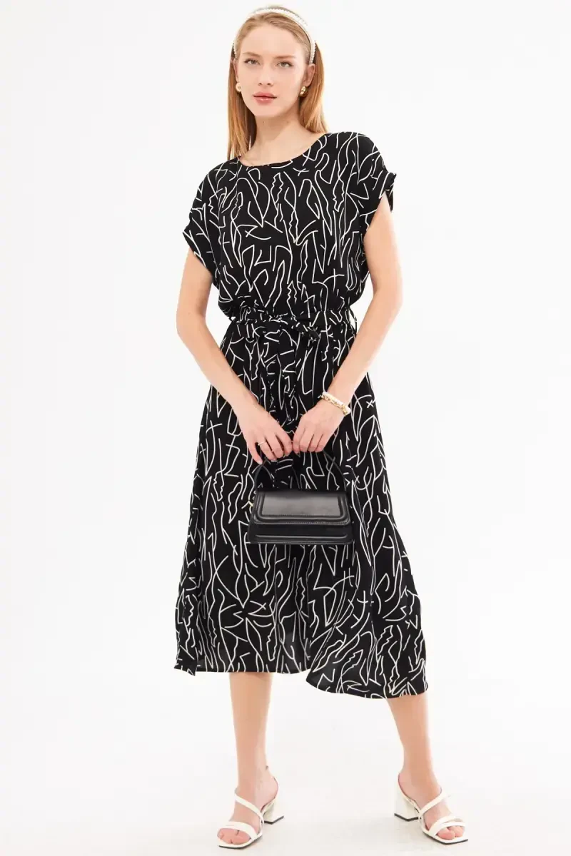 The Women's Black and White Elastic Waistband Tie Detailed Patterned Dress ARM-22Y001044-Black is a candidate to be the indispensable part of your wardrobe with ARMONİKA's original design. Enjoy all-day comfort with the unique softness and comfort offered by its viscose blend fabric. This dress, which perfectly reveals your body lines thanks to its A-line silhouette, highlights your elegance without sacrificing your freedom of movement. The durability and high-quality texture of the woven fabric offer long-lasting use, while its plain pattern makes it easy to combine with all kinds of accessories. This midi-length dress, which you can choose for daily use or special occasions, allows you to express your elegance in any environment. The elastic waistband detail gently emphasizes your waist and creates a feminine look while providing a comfortable wearing experience. The V-neck design emphasizes your elegance, while the standard sleeve type draws attention with its suitability for daily use. The 60% viscose and 40% polyester blend fabric both increases durability and offers easy ironing. Designed with the timeless harmony of black and white, this dress is an ideal choice for women who want to achieve a stylish and modern look. The ARM-22Y001044-Black model is ready to be the most loved piece of your wardrobe. Enjoy both comfort and elegance with this dress. Whether you're attending a special event with heels or going for a daily stroll with sandals, this dress will accompany you in any situation. Don't miss this unique design to feel special and reflect your style.