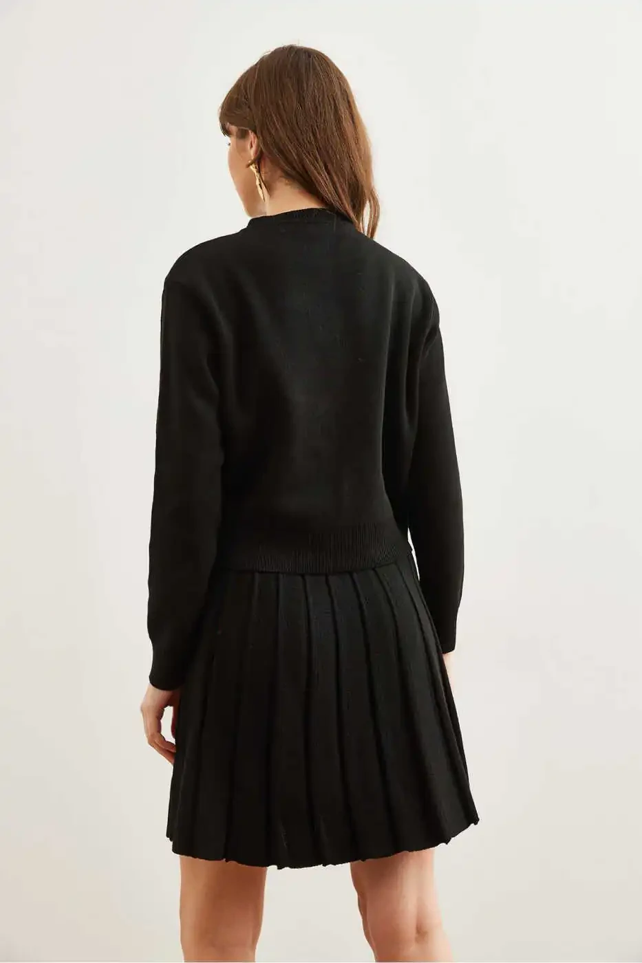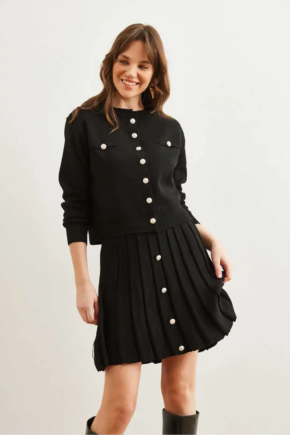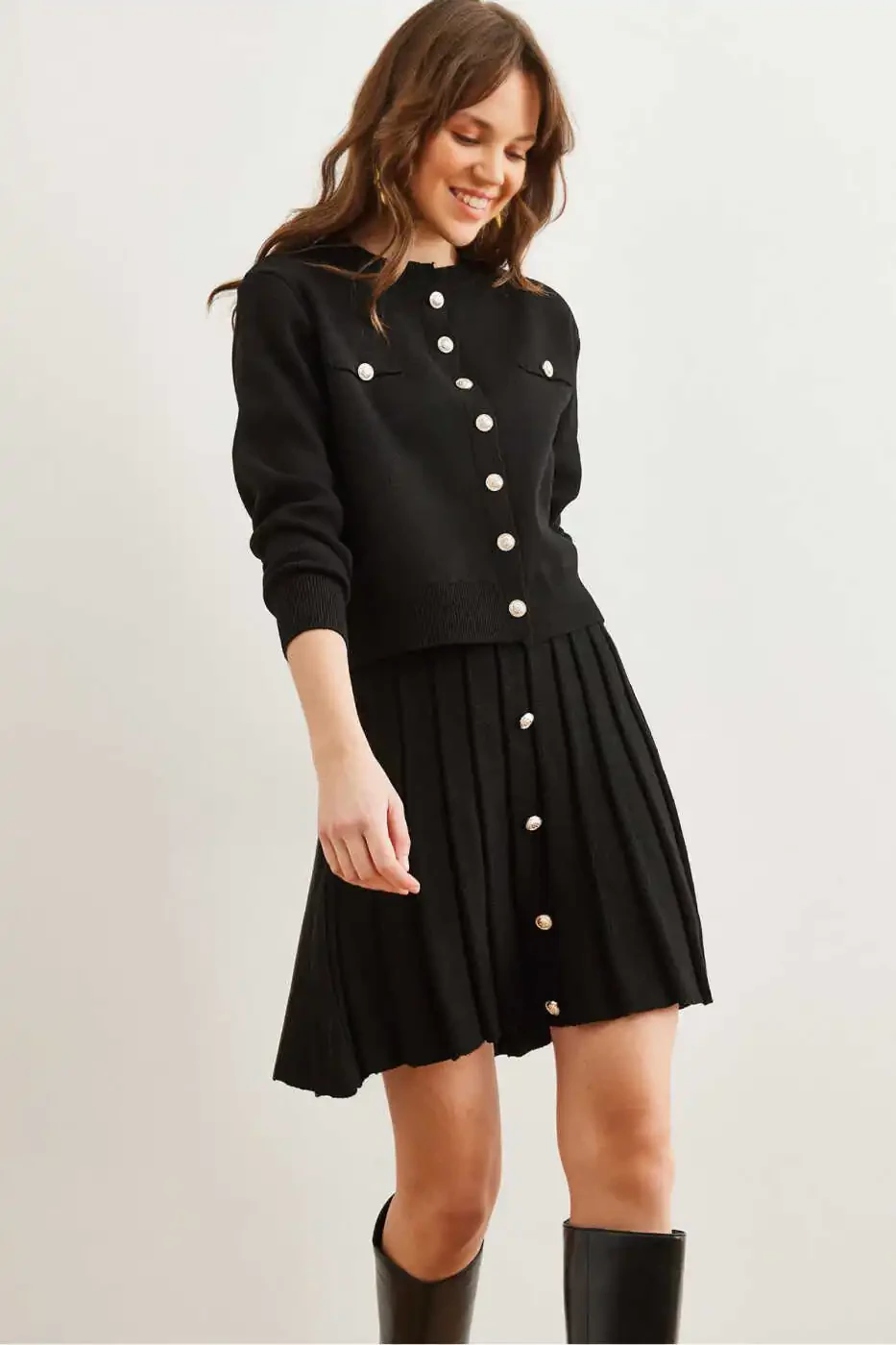 Women's Black Knit Set, Button Detail Knit Set, Pleated Skirt Knit Set, Acrylic Knit Set, Women's Knit Set, comfortable Knit Set, stylish Knit Set