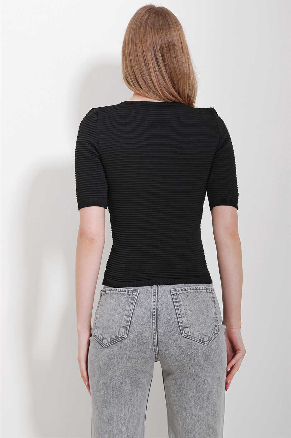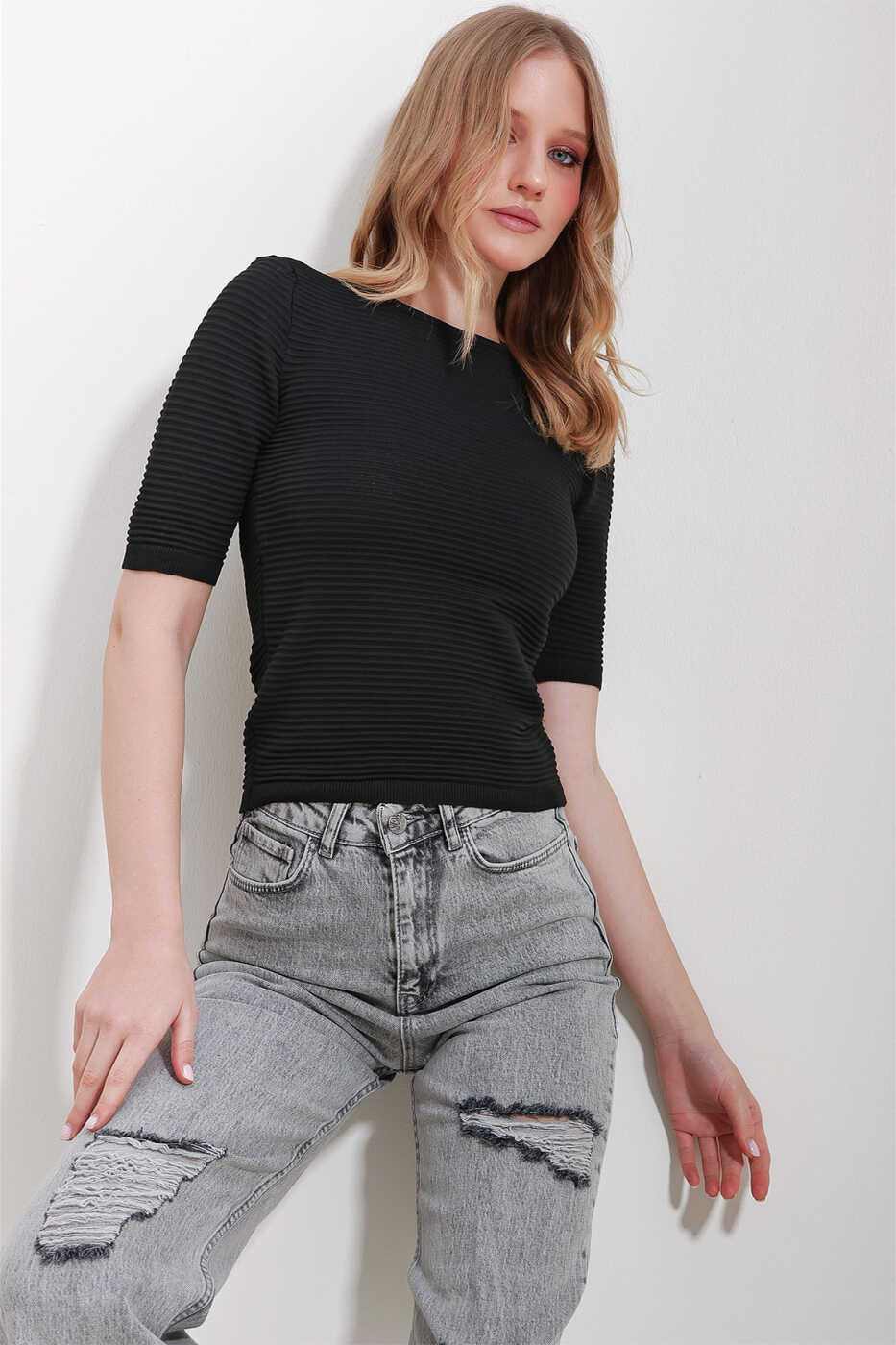 Combining style and comfort, the Women's Black Crew Neck Ribbed Lace Half Sleeve Knit Blouse will be an indispensable part of your wardrobe. The soft and breathable knit provides comfort all day long, while the crew neck detail and ribbed texture add a touch of elegance to your style. The lace design adds a feminine touch, while the half sleeves make it comfortable to wear in every season.