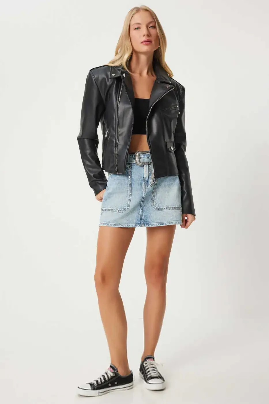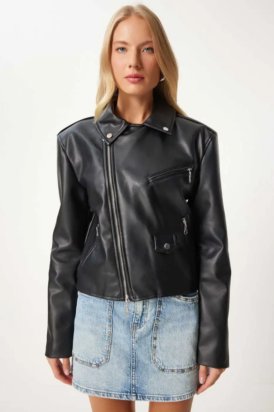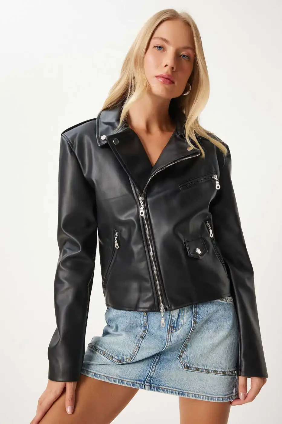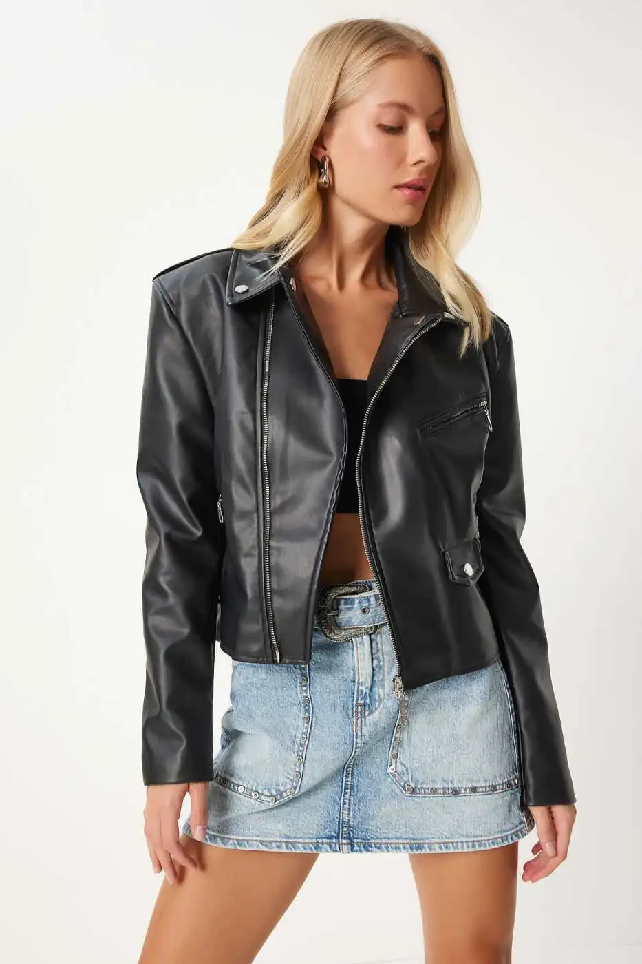 The perfect choice for a chic and edgy look, the Women's Black Faux Leather Crop Biker Jacket is an essential addition to your wardrobe. Crafted from soft and durable faux leather, this jacket combines comfort and style. The crop cut creates a modern and feminine silhouette, while the biker-inspired details add an edgy and powerful vibe. The zippered front closure, side pockets and shoulder details give the jacket a stylish touch. This jacket can be paired with jeans, skirts or dresses to suit any style. It is the perfect choice for a casual or dressy look, day or night.
