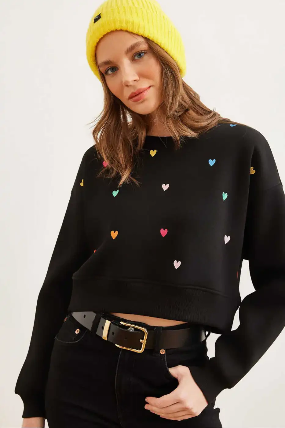 Thick sweatshirt, women's sweatshirt, heart embroidered, black sweatshirt, crop sweatshirt, thistle pattern, comfortable sweatshirt, everyday wear, Trendyol, Olalook