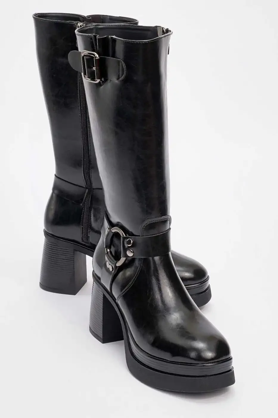 The ROCK Black Leather Buckle Zippered Women's Platform Heeled Boot has a zippered design that makes it easy to put on and take off, allowing you to achieve a comfortable and stylish look. Additionally, its durable construction ensures that you can use it for many years to come. This eye-catching boot will complement any outfit and complete your style.