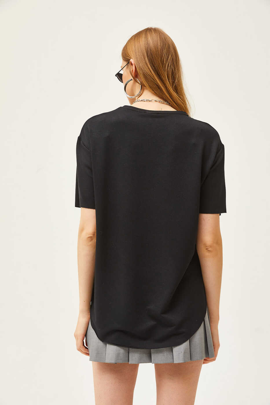 The Women's Black Modal Buttoned Soft Textured Six Oval T-Shirt TSH-19000771 is a perfect choice to complete your daily style with elegance and comfort. Made from modal fabric, this t-shirt combines style and comfort. The six oval design adds a modern touch to the t-shirt, while the buttoned detail provides a stylish touch. Its black color makes it compatible with all kinds of combinations, making it a great option to complete your style in your daily life or on special occasions.