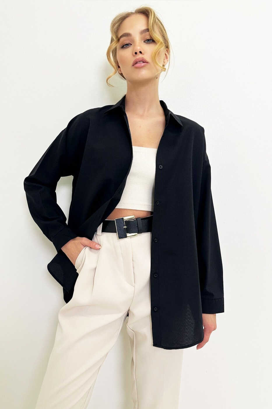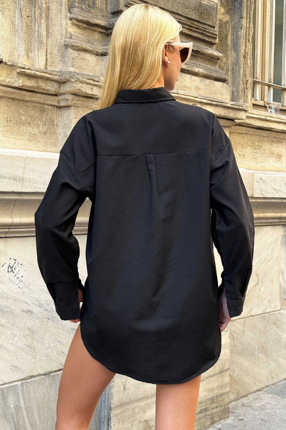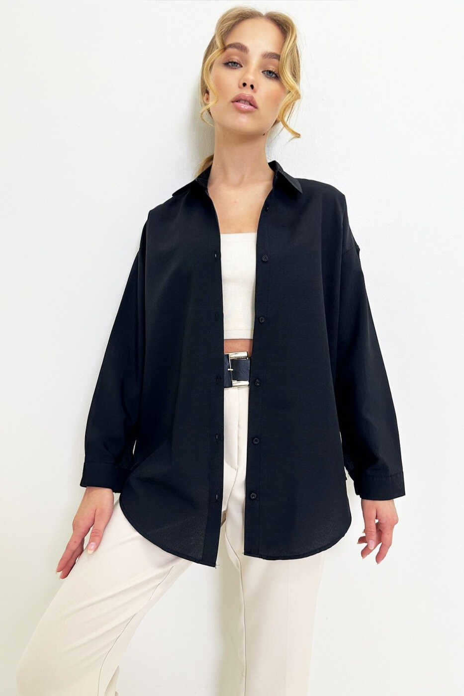 The Women's Black Oversize Long Woven Shirt is a perfect choice for everyday wear. You can combine it with jeans, skirts, leggings, or shorts to get a stylish look.
