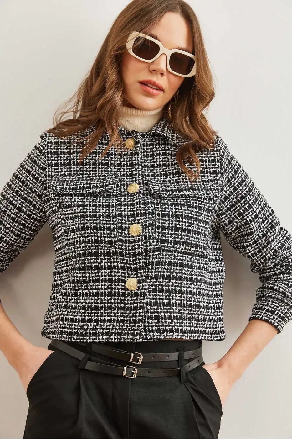 Introducing the Women's Black Pocketed Buttoned Glitter Detail Tweed Jacket, a wardrobe staple that combines style and comfort.
