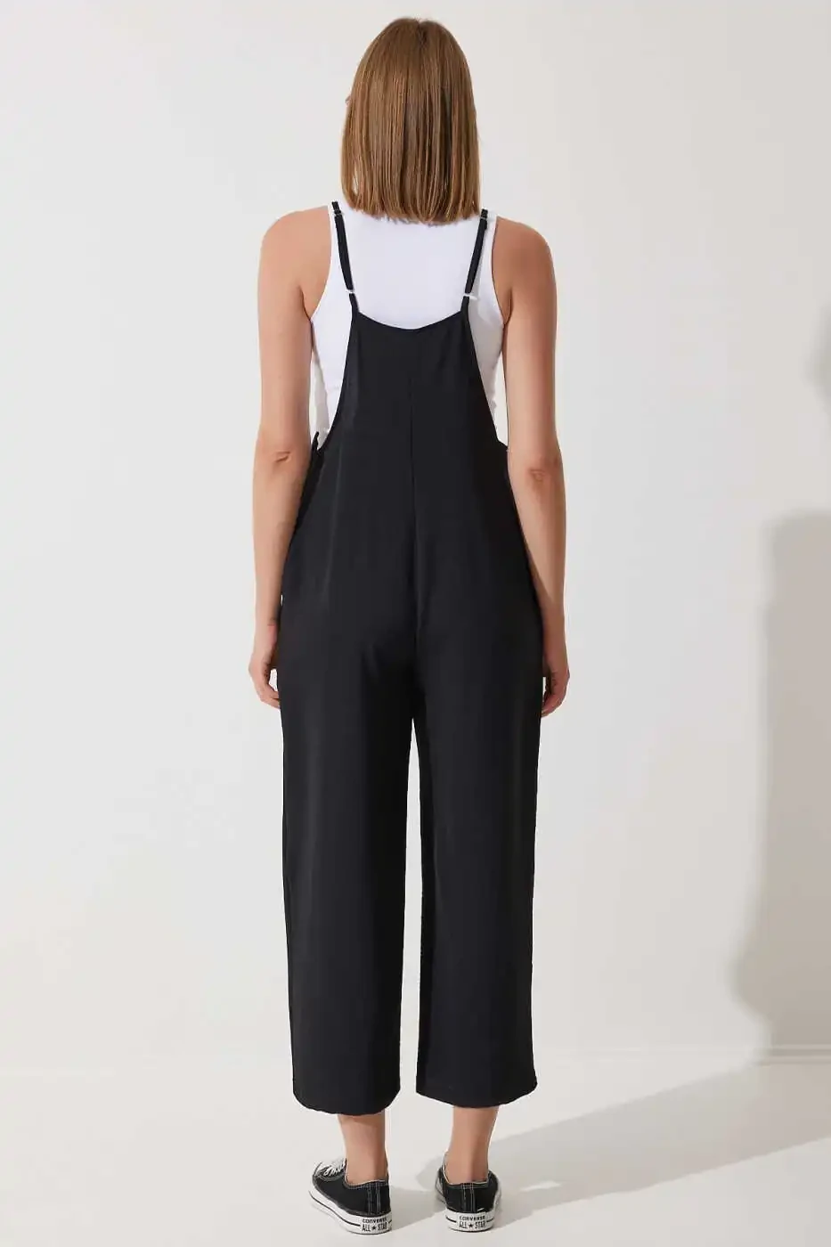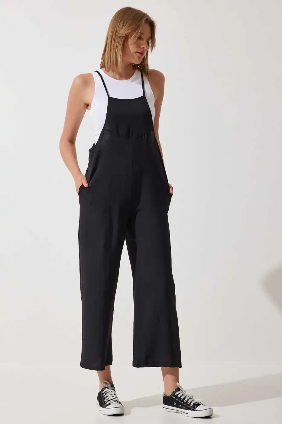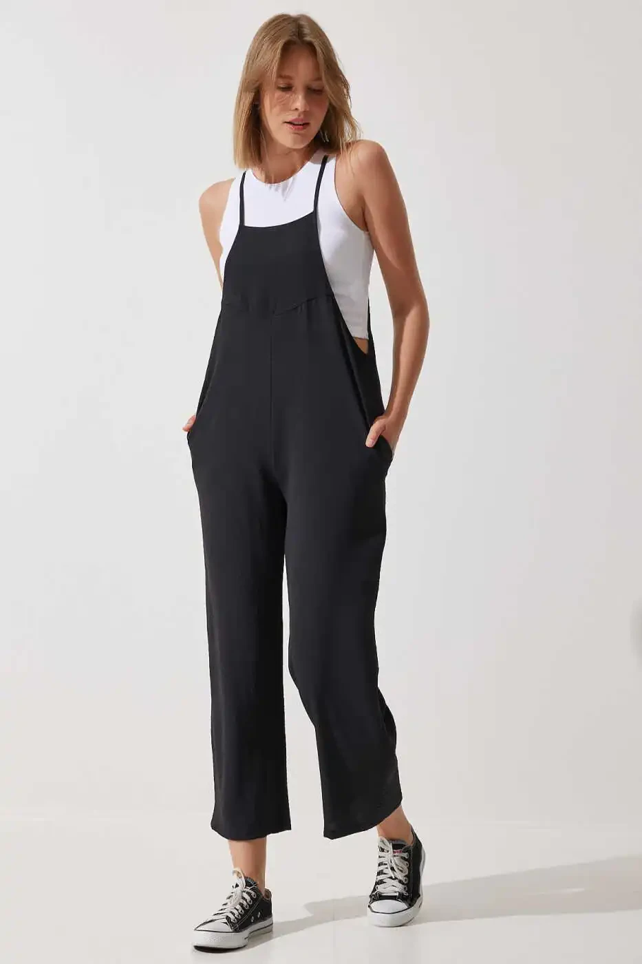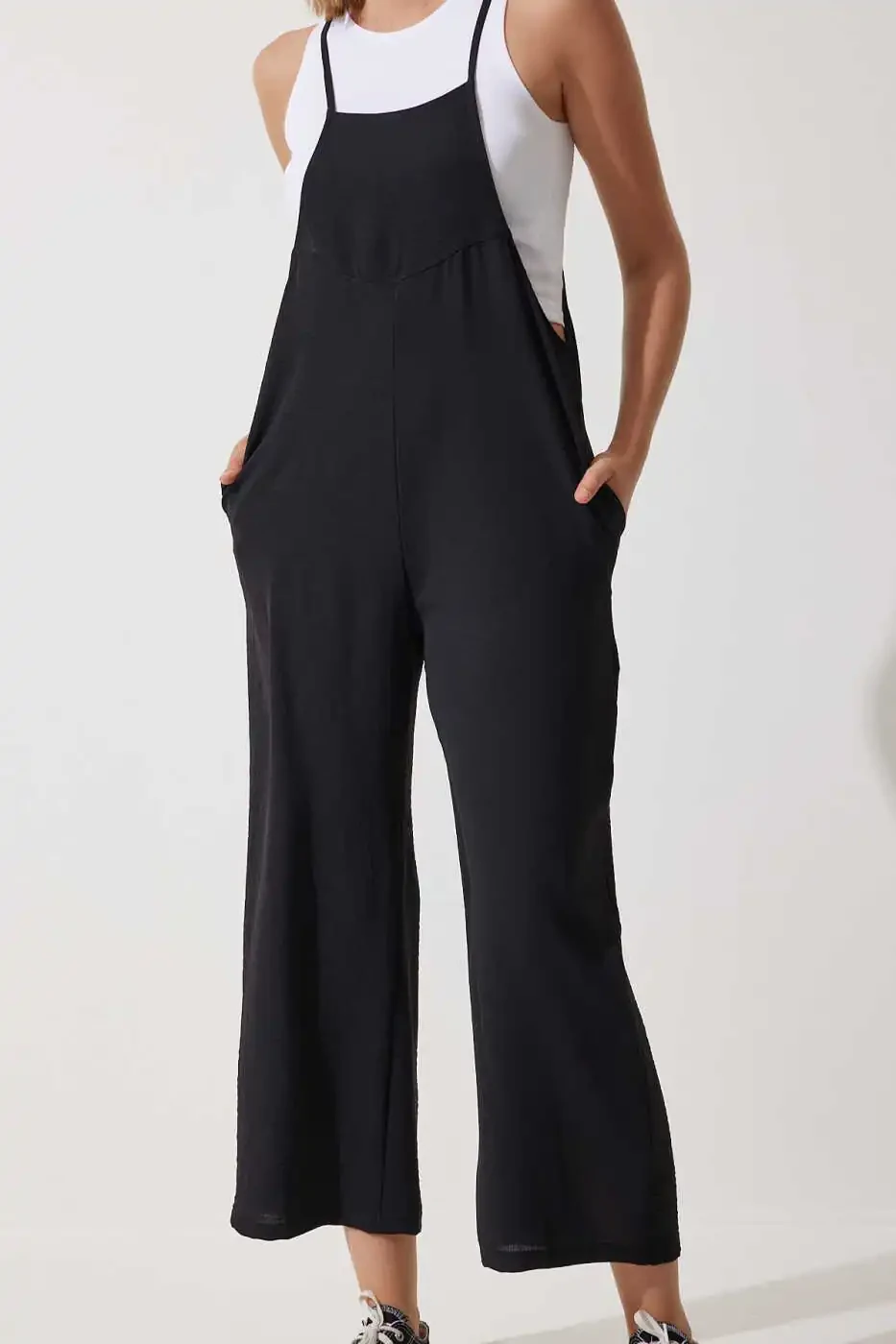 Designed for modern women seeking timeless elegance and comfort, the Women's Black Pocket Gardener Jumpsuit DD00910 will become an indispensable part of your wardrobe. Appealing to all age groups, this versatile jumpsuit can be easily worn in a variety of settings, from daily use to special invitations. This jumpsuit, which stands out with the elegance of black and its modern design, will add a sophisticated touch to your style. The square neckline offers a feminine look, while the strapped arm design provides freedom of movement and helps you stay cool, especially in the summer months. The polyester and lycra blend fabric offers both a durable and flexible structure, providing a comfortable wearing experience throughout the day. Thanks to its practical pockets, you can carry your small belongings such as phone and keys with you. Its relaxed silhouette and straight-leg design create a modern and stylish look, while the woven fabric type ensures that the jumpsuit retains its shape for a long time. When cleaned according to the washing instructions, your jumpsuit will maintain its first-day quality for a long time. Thanks to its regular fit, this jumpsuit, which perfectly fits every body, is an ideal choice for women who seek both comfort and elegance. Its plain black color can be easily combined with tops, shoes and accessories in different colors and patterns, allowing you to create your own style. This jumpsuit, which perfectly matches both sneakers and heels, can adapt to any style. Whether you dress for daily life or a special occasion, you will always feel stylish and comfortable with this jumpsuit. Don't miss this product offered with Trendyol assurance!