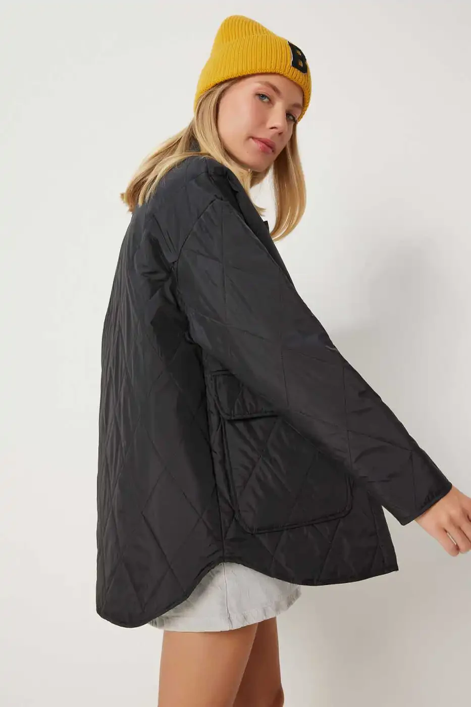 Experience style and comfort with the Women's Black Pocket Oversized Quilted Jacket FO00001! With its simple and chic design, this jacket will perfectly match any outfit and will become an indispensable part of your daily life. Easily put on and taken off with its practical button closure system, the jacket offers you comfortable freedom of movement and a modern look with its regular length and oversized fit. Thanks to its quilted weave type, it keeps you warm while providing a comfortable wearing experience. Made from 100% quality material, the jacket guarantees long-lasting use. For detailed material information and washing instructions, please check the inner label. Its spacious pockets allow you to carry your personal belongings safely. Enjoy timeless style with its design that appeals to all ages. The durable woven fabric structure ensures that your jacket maintains its shape for a long time. Benefit from this product, sent by Trendyol and offered at a campaign price, while stocks last. You can shop with peace of mind with our 15-day free return option. Feel special with the timeless chic of black and the comfort of the oversized trend!