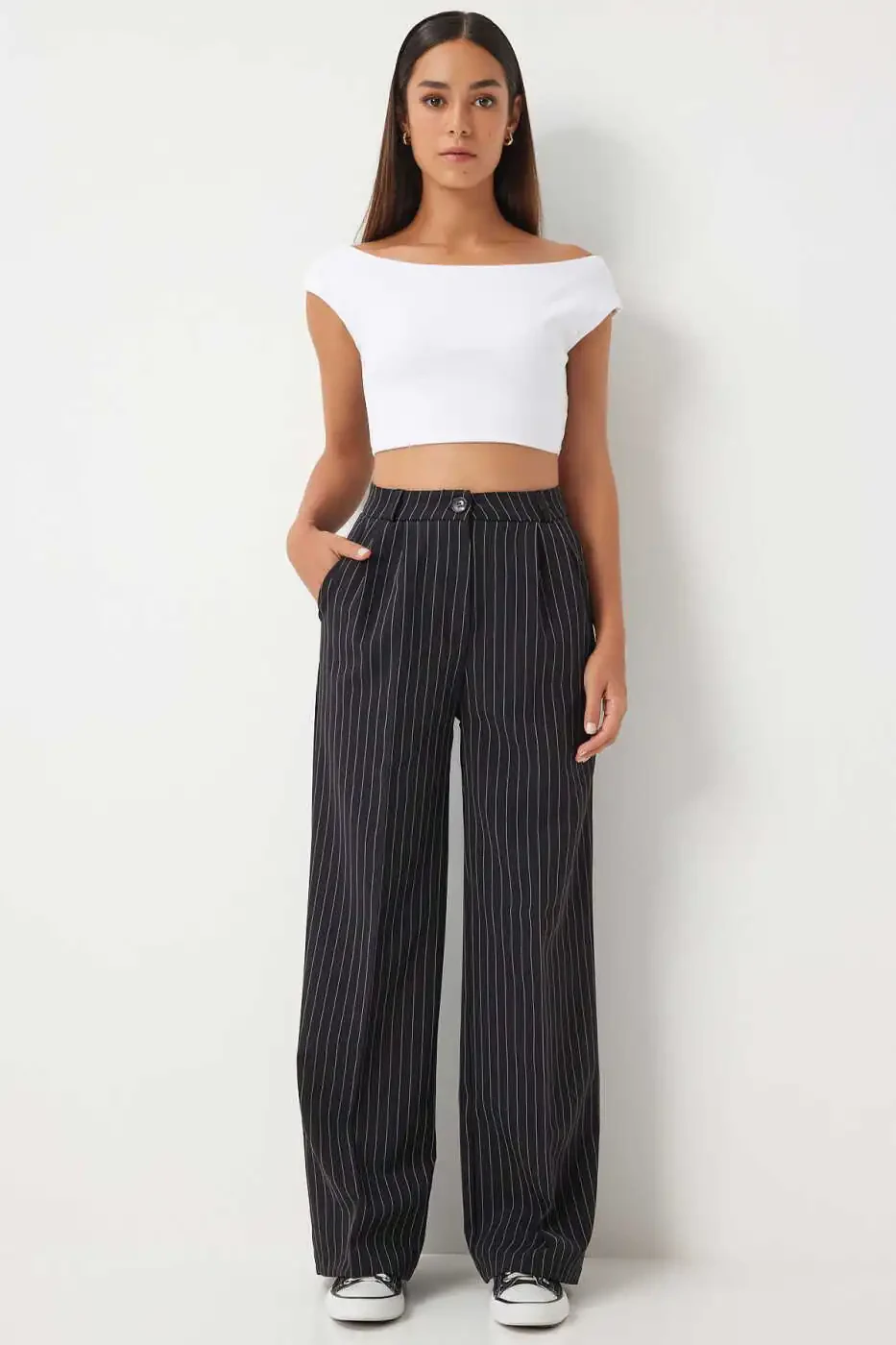 Meet the Women's Black Fine Striped Masculine Palazzo Pants DW00005, combining timeless elegance and comfort! These pants will become your new wardrobe favorite, offering a stunning look for both everyday life and special occasions. The fine stripes add a sophisticated touch, while the masculine design reflects a modern and powerful style. The wide-leg cut perfectly complements your elegant silhouette, while the comfortable fit doesn't restrict your freedom of movement throughout the day. Made from high-quality, 100% woven fabric, the pants offer a comfortable experience with their breathable structure. The button details add a stylish touch and enhance functionality. With its normal waist height and loose fit, it sits perfectly on your body and can be easily combined with different tops. The timeless elegance of black and the sophistication of the fine stripes will make these pants an indispensable part of your wardrobe for women of all ages. Plus, you can shop with peace of mind thanks to the 15-day free return option. Don't miss this special product offered to you at a campaign price with over 100 in stock!
