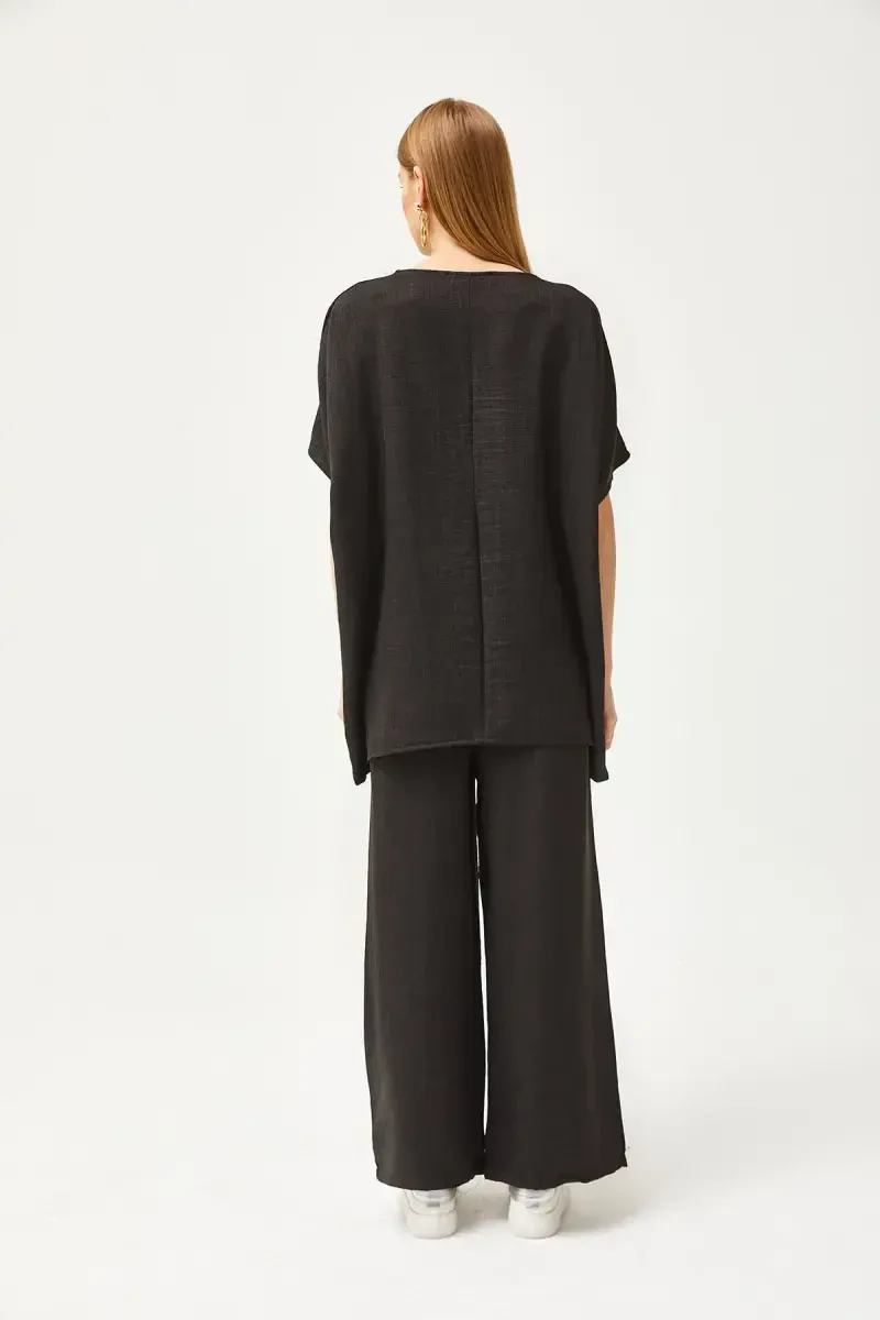 Designed for women to feel stylish and comfortable, this special combination combines the elegance of black and the natural texture of linen. The loose fit of the blouse does not restrict your freedom of movement, while the stylish stance of the palazzo pants will make you stand out in any environment. The light and breathable fabric of the blouse provides freshness throughout the day, while the side pockets of the palazzo pants offer practical use. The black color of the combination easily adapts to all kinds of accessories and shoes, allowing you to create different combinations. Whether you catch a casual elegance with sneakers, or prepare for a special invitation with heels, this suit can adapt to any situation. The natural wrinkles of the linen fabric add a bohemian feel to the combination, while the loose cut prioritizes comfort. This combination will not only make you look stylish, but also make you feel good. A timeless piece that you will enjoy having in your wardrobe. This suit, which keeps you cool in summer and can be combined with a light jacket in spring, offers versatile use. While the classic and timeless stance of black continues to be a trend every season, the natural texture of linen fabric always provides a modern and stylish look. This combination is not just a piece of clothing, but also a lifestyle. It is an ideal choice for women who care about comfort and do not want to compromise on their style. Discover this combination now to feel special and dazzle with your elegance!