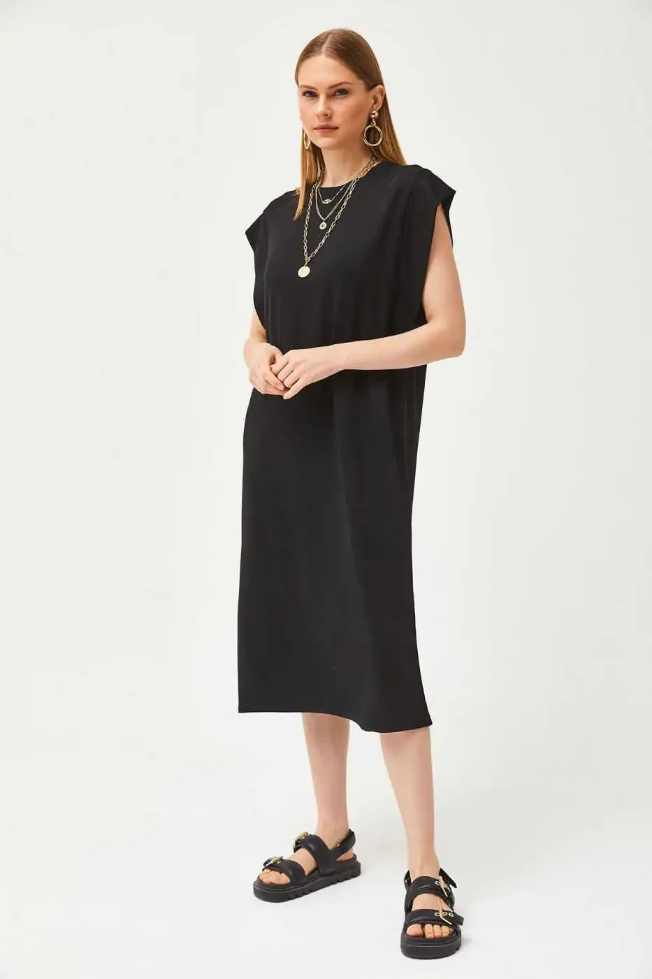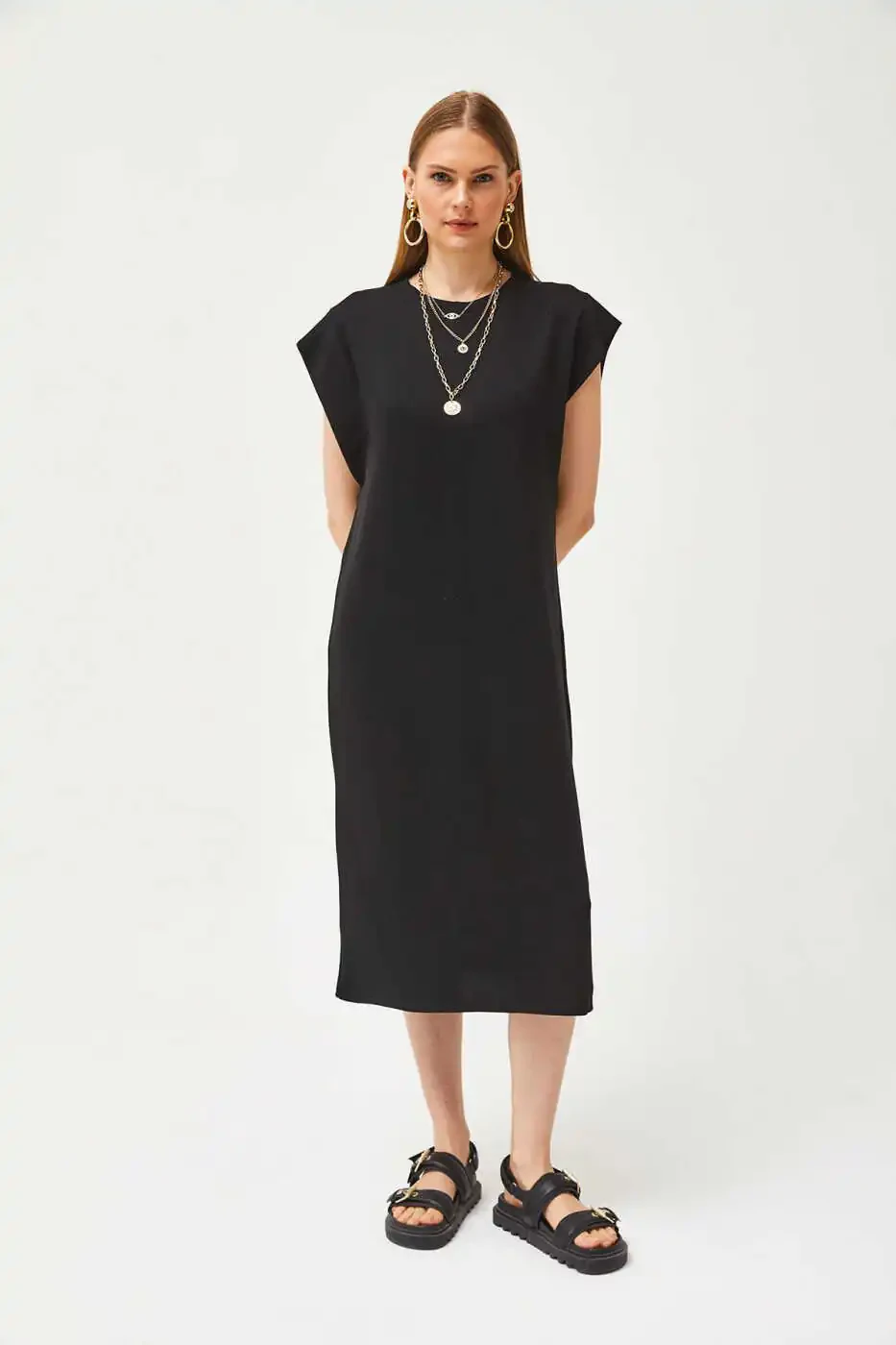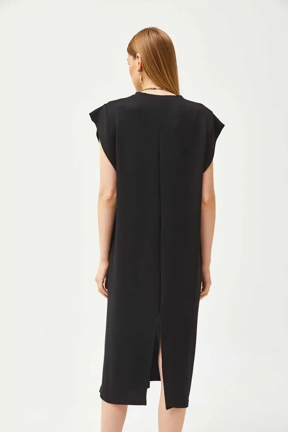 Create a dazzling look with this magnificent dress that combines elegance and sophistication. The black color and underarm details accentuate your femininity, while the slit detail in the back adds movement. Crystal embellishments add a touch of sparkle to the night, while the elegant cut makes you look flawless at all times. An ideal choice for dazzling at special occasions, invitations or night outings.