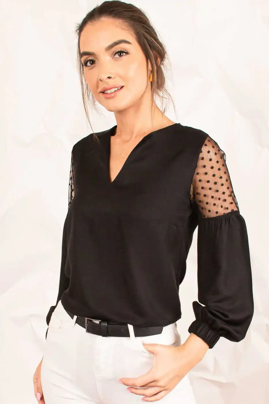 The Women's Black V-Neck Puff Sleeve Tulle Blouse is a choice that suits every style and makes you stand out in any environment. It will complement your style on special occasions, while providing a comfortable and stylish look in everyday life.