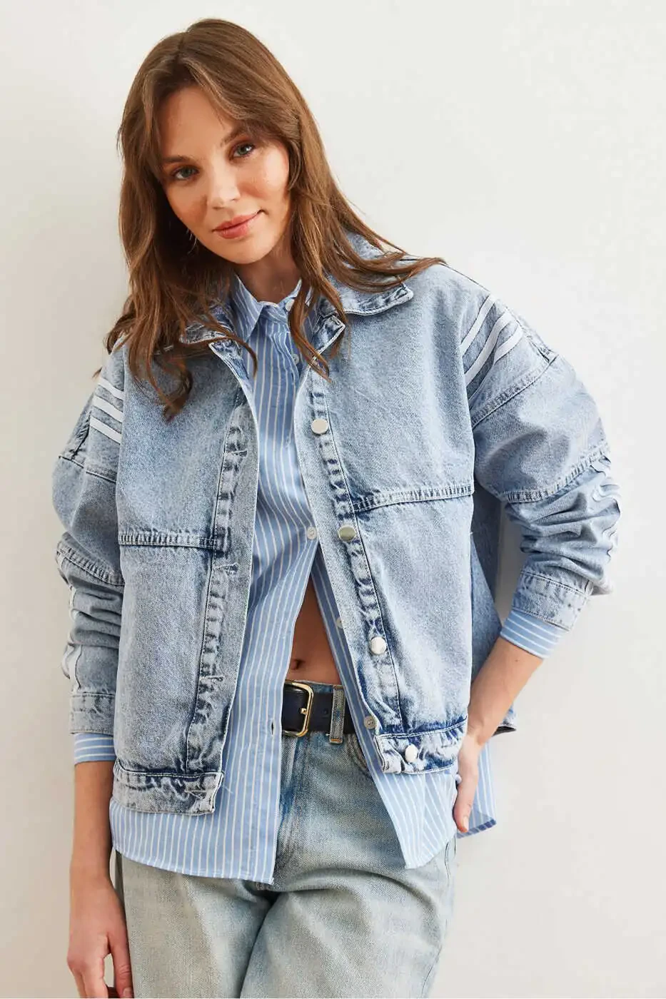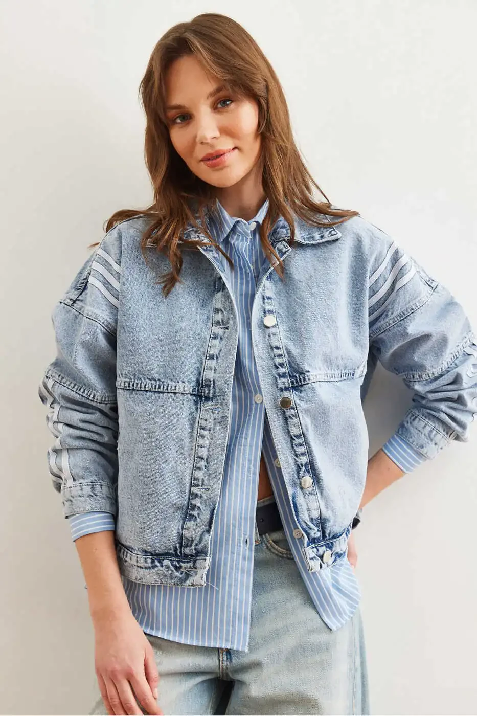 Denim Jacket, Women's Jacket, Blue Jacket, 3-Stripe Detail, Pocket Jacket, CKT-19000421