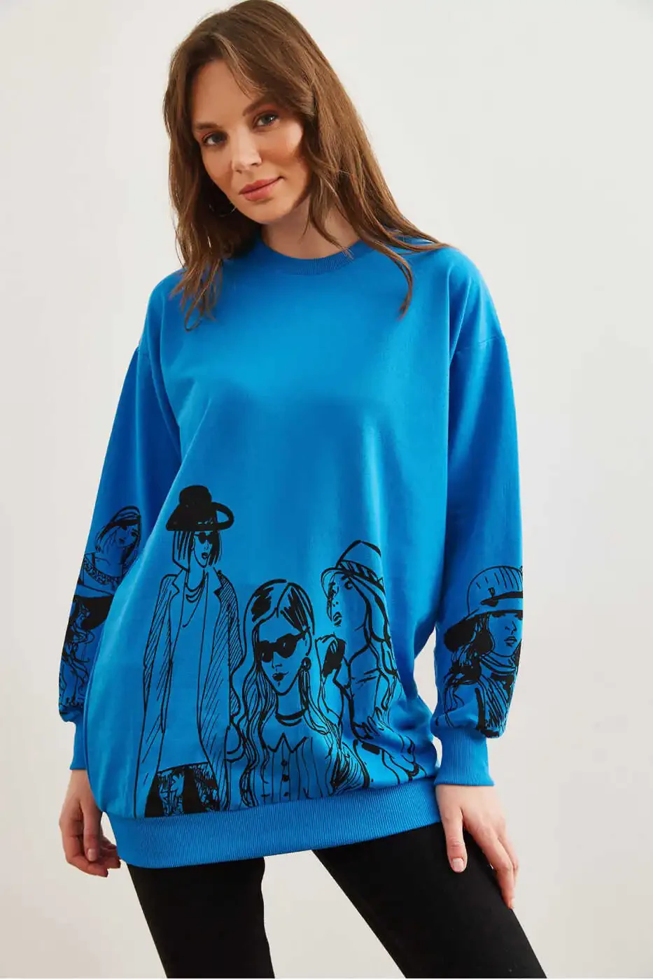 Women's Blue Figure Oversized Sweatshirt | SWT-19000452