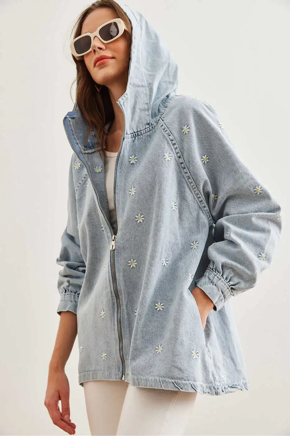 Women's Blue Zippered Pocket Hooded Embroidered Denim Jacket, Olalook, Trendyol, Denim Jacket, Blue Jacket, Zippered Jacket, Hooded Jacket, Embroidered Jacket