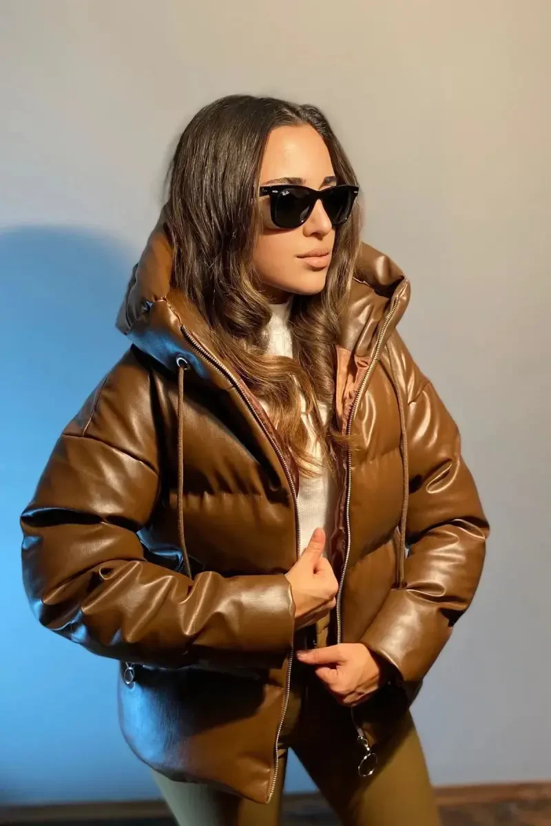 Stay stylish and warm in cold weather with the Women's Brown Leather Hooded Puffer Jacket! This special design jacket will be an indispensable piece by combining comfort and style in your daily use. Offered with MEECY assurance, this jacket stands out with its quality material structure and modern details. Thanks to its lined structure, it provides extra warmth in cold weather, while its hooded design protects your head and neck from wind and cold. The zippered closure system allows you to easily put on and take off the jacket, while the pocketed design allows you to safely carry your belongings. Its plain pattern offers a timeless look and can be easily combined with all kinds of clothes. The long sleeve length completely covers your arms and protects them from the cold, while the puffer silhouette gives a modern and trendy look. The brown leather look takes your elegance to the next level, while the durable woven fabric type ensures long-lasting use. 100% polyester material guarantees that the jacket is light and durable, while offering resistance to water and wind, protecting you even in bad weather conditions. The standard sleeve type provides freedom of movement, while the jacket collar detail adds a stylish touch. This jacket is not just a piece of clothing, but also an expression that reflects your style. It is an ideal choice for women who want to stay warm and stylish without sacrificing their elegance on cold winter days. You can easily use this jacket in your daily activities, weekend trips or stylish meetings in the city, and it is a candidate to be the most loved piece of your wardrobe. Always feel warm, stylish and safe with the MEECY Women's Brown Leather Hooded Puffer Jacket.