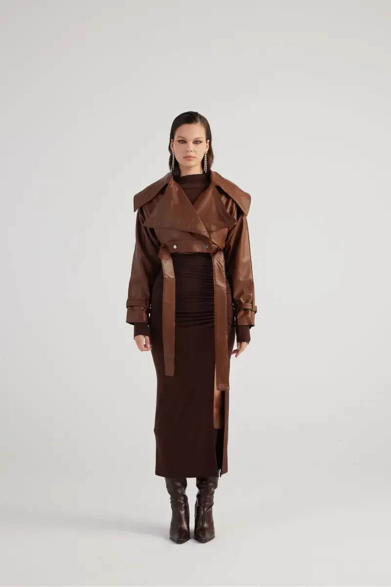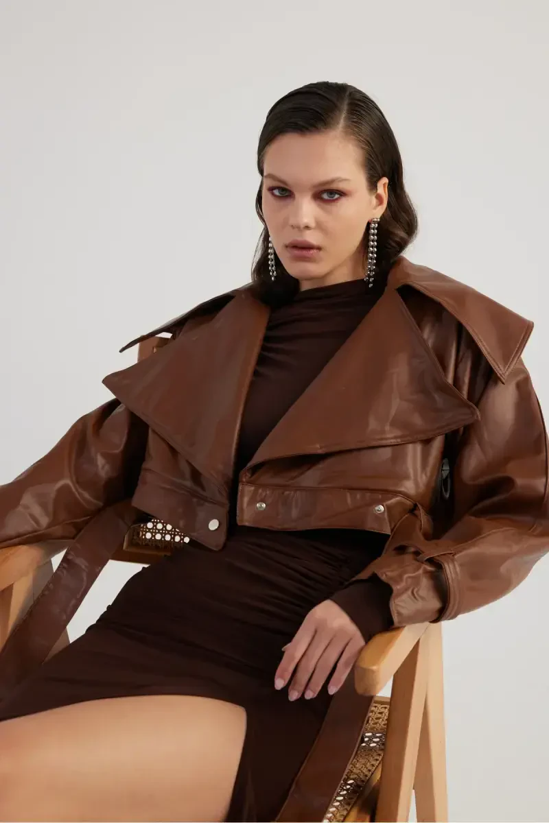 women's leather jacket, brown jacket, snap jacket, lined jacket, Neeko jacket, polyurethane jacket, women's clothing, leather jacket, brown leather jacket, seasonal jacket