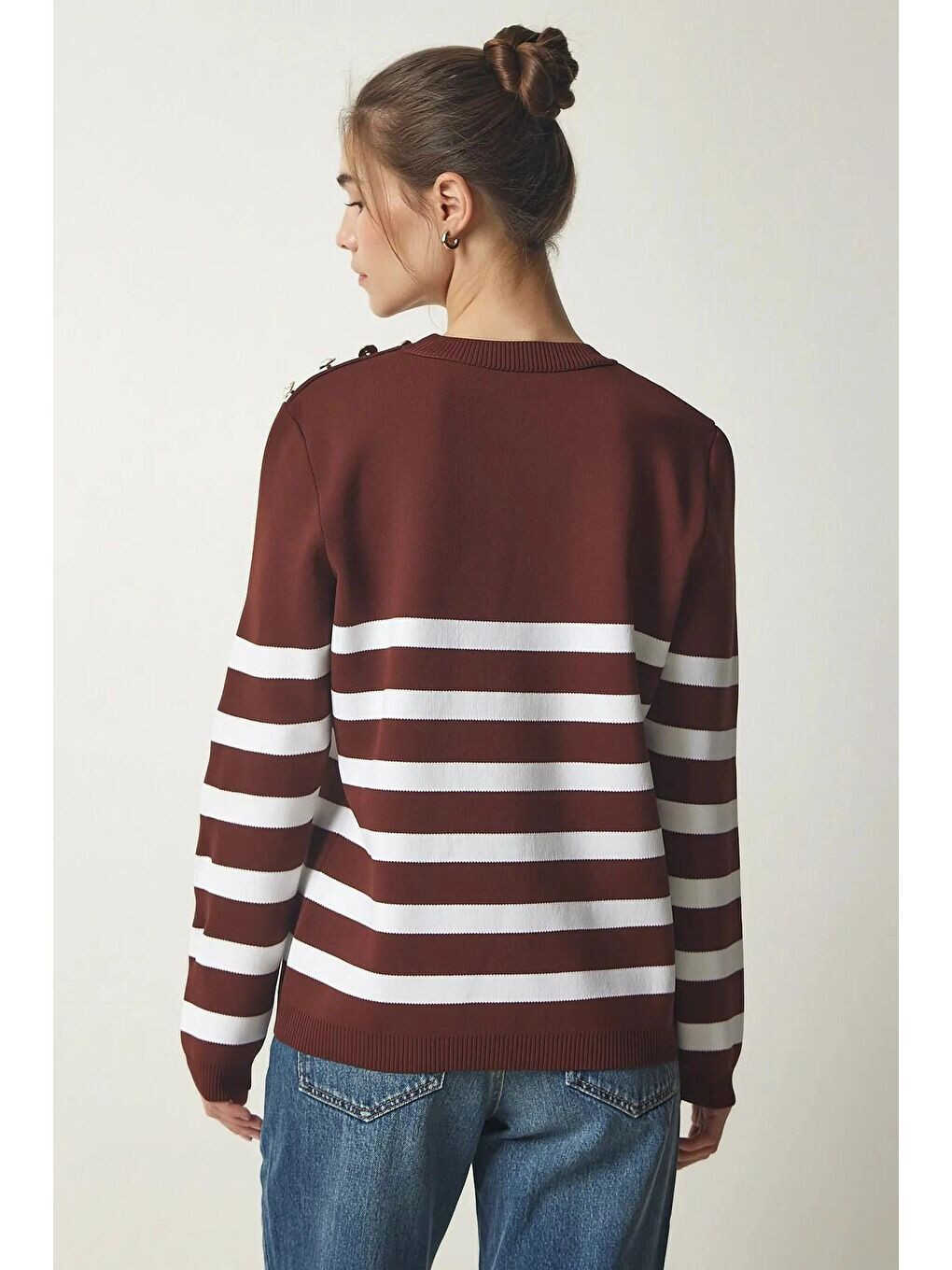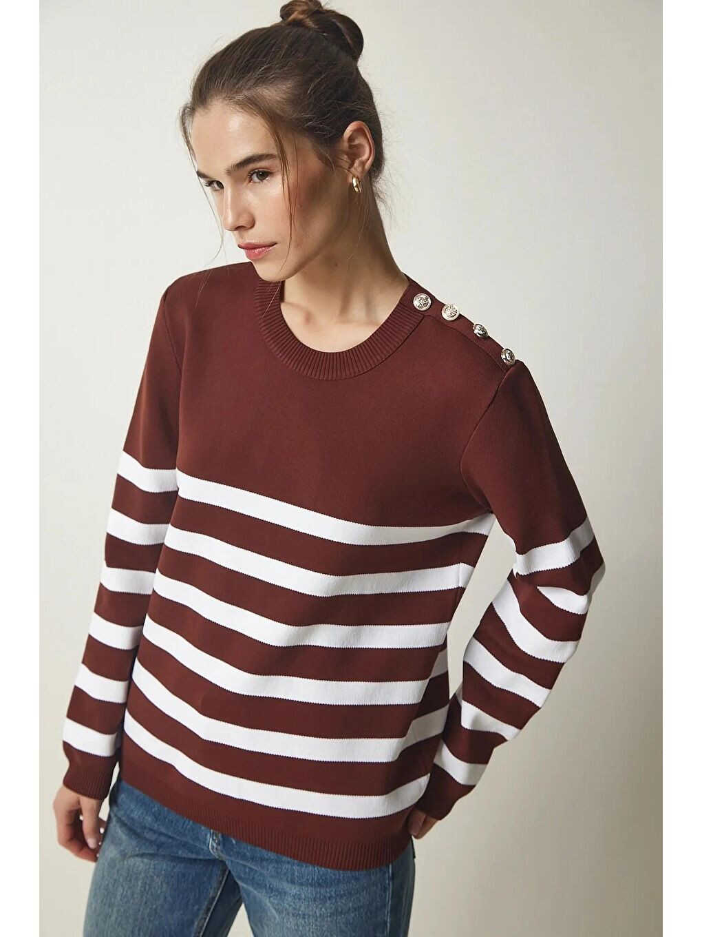 This women's sweater, which combines style and comfort, will be an indispensable part of your wardrobe. Featuring a brown and white striped design, the sweater offers a stunning look with its crew neck and off-shoulder button details that will complete your style. Made from soft and high-quality fabric, the sweater will provide comfort all day long. You can choose this sweater to achieve a stylish and elegant look in your everyday combinations, business life, or at special events.