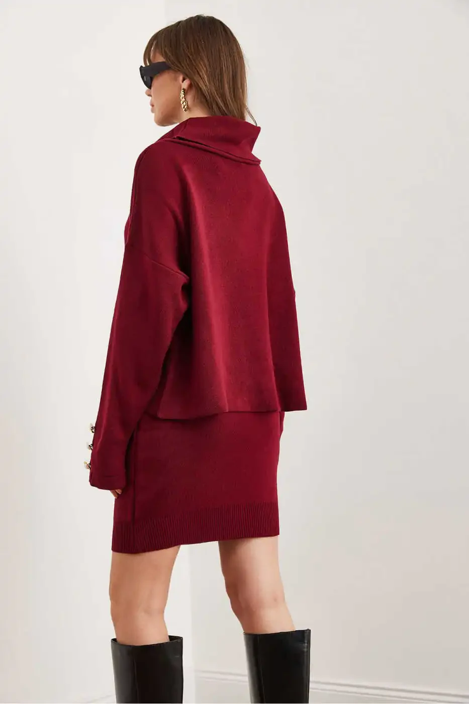 Trendyol Exclusive Women's Burgundy Top Button Detailed Sweater Pleated Bottom Knit Set