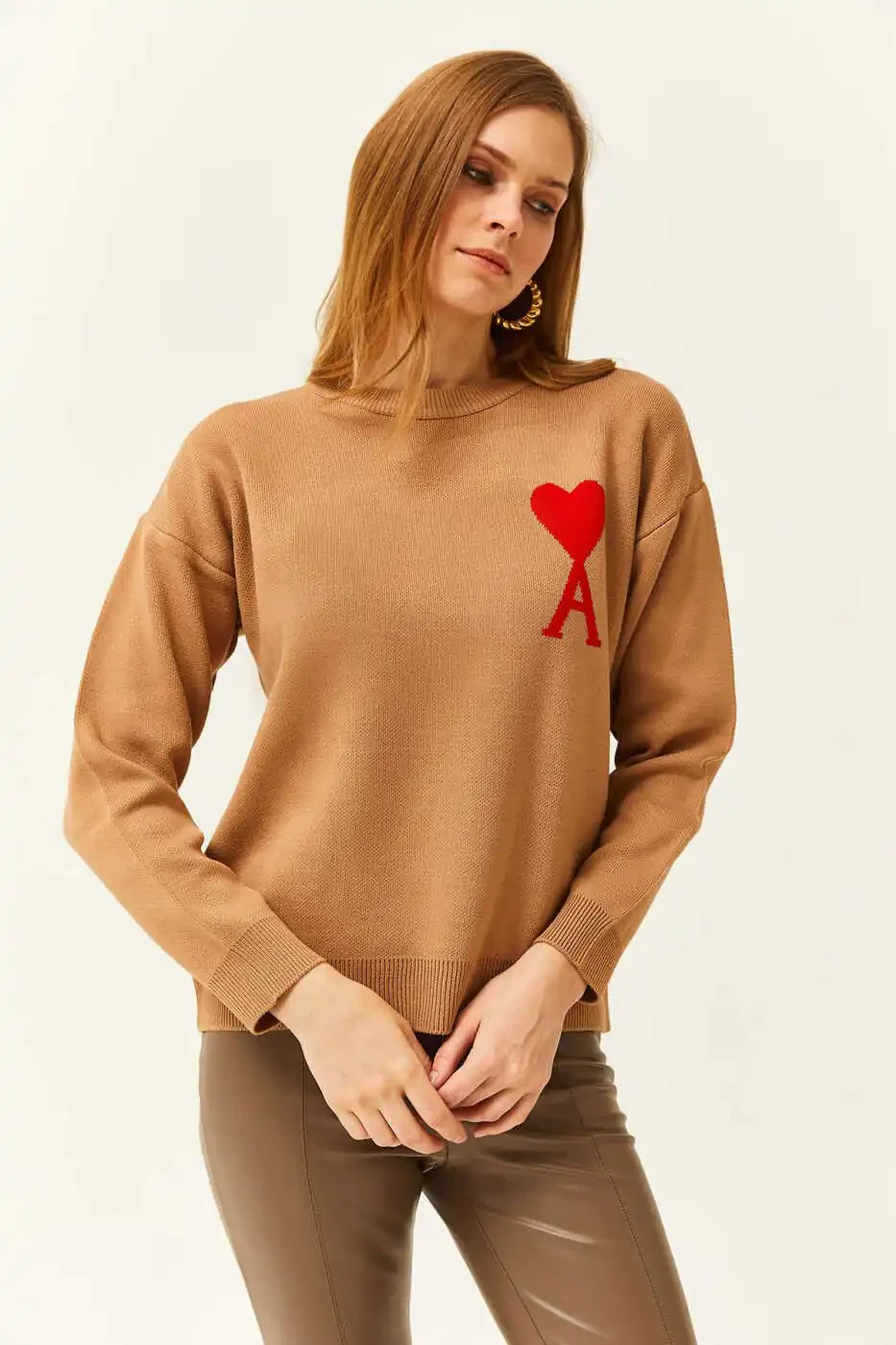Women's Camel Heart Detailed Knit Sweater: Stylish and Cozy