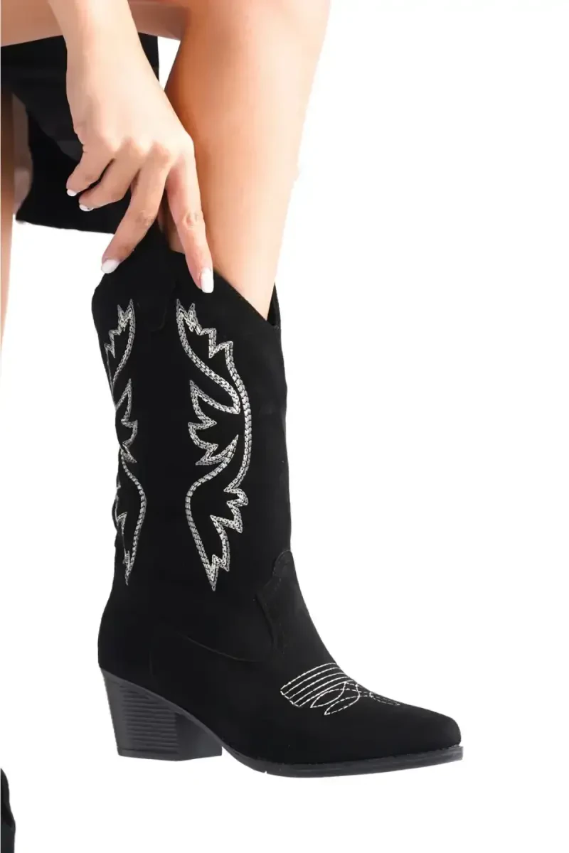 The Women's Cowboy Boots - Embroidered Black Suede, offered by Zain Express, have a special design that combines both elegance and comfort. This cowboy boot is made with a woven fabric type, guaranteeing durability and long-lasting use. This boot, which attracts attention with its horror-themed patterns specially designed for the Halloween collection, adds a different dimension to your style and allows you to achieve a modern and trendy look with the Fashion Forward persona. Produced with the principle of sustainability, this environmentally friendly boot helps you take safe steps by offering non-slip properties thanks to its thermoplastic sole material. The 100% synthetic leather material component both increases durability and provides long-term use. It offers practical use thanks to its easy-to-clean structure, while synthetic leather details give the boot an aesthetic appearance. This boot, which offers comfort and elegance together with its thick-heeled design, provides ideal comfort and an elegant stance with its medium heel height (5-9 cm). Suitable for adult women and young girls, this cowboy boot creates a simple and timeless style with its plain pattern. It can be easily put on and taken off thanks to its zippered fastening style. It can be used comfortably in any environment with its versatile design suitable for your day and night combinations. Synthetic leather is preferred as the lining material to ensure integrity. Thanks to its waterproof feature, it keeps your feet dry even in rainy weather. The synthetic leather material used in the insole guarantees your foot's comfort, while the suede upper material adds a luxurious touch while increasing durability. Embroidery details add a unique touch to the boot, while black color represents nobility and elegance. Complete your style with this cowboy boot, which will be an indispensable part of your wardrobe, and make a difference in every step. You can easily use this boot, which offers both comfort and elegance, whether with your daily combinations or on special occasions. This cowboy boot, which you can use for many years thanks to its quality material structure and careful workmanship, will add a different dimension to your style. It is an ideal choice for women looking for elegance and comfort together.