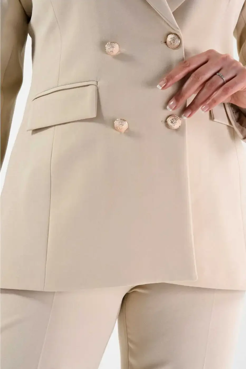 This suit, combining style and comfort, is a must-have for every woman's wardrobe. The cream color complements any outfit, helping you complete your style. The blazer jacket stands out with its stylish buttons and sharp lines, while the belted pocket straight leg pants help you create an elegant silhouette by making your legs look longer and thinner.