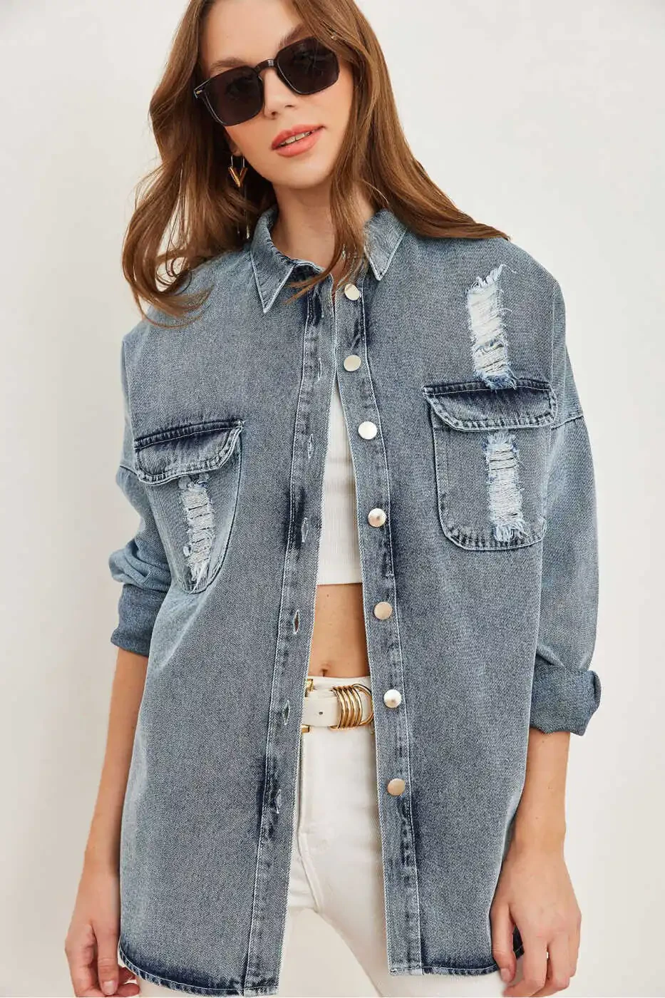 This dark blue denim jacket for women offers a modern and stylish look. The applique details on the back and the laser-cut pockets give the jacket a striking appearance. Made from 100% cotton, the jacket offers a soft and comfortable wearing experience. With a length of 72 cm and a chest measurement of 58 cm, it comes in size S/36. With more than 10 pieces in stock, the product is shipped by Trendyol - Olalook. Sold at a campaign price, the product has a limit of 10 pieces. You can benefit from the free return within 15 days.