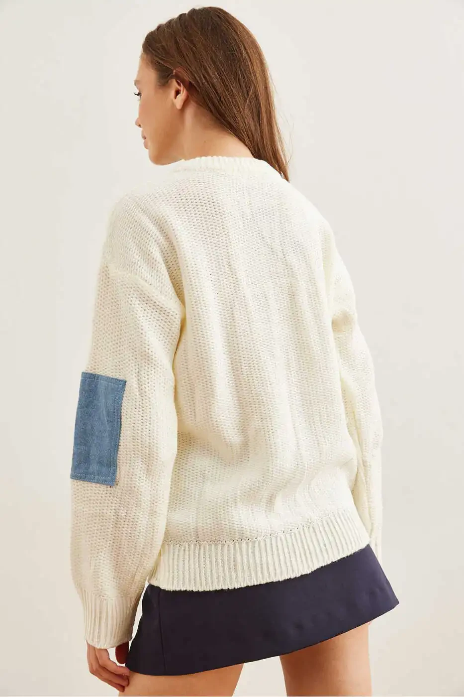Women's Ecru Blue Denim Trim Pocket Loose Knitted Cardigan is an excellent choice to complete your comfortable and stylish look.## Features:- **Material:** 70% Acrylic, 30% Wool- **Size:** Length/Chest: 60/51 cm- **Model Measurements:** Height: 1.74 m, Bust: 80 cm, Waist: 60 cm, Hip: 90 cm- **Size on Model:** One Size- **Pockets:** Two front pockets## Benefits:- Soft and comfortable fabric provides comfort all day long.- Denim trims add a stylish touch.- Loose fit allows freedom of movement.- Standard size fits most body types.- Versatile and can be used for everyday or special occasions.## Things to Consider:- Colors may vary slightly from studio shots due to lighting differences.Order your Women's Ecru Blue Denim Trim Pocket Loose Knitted Cardigan today with Trendyol's advantages and have the timeless style.