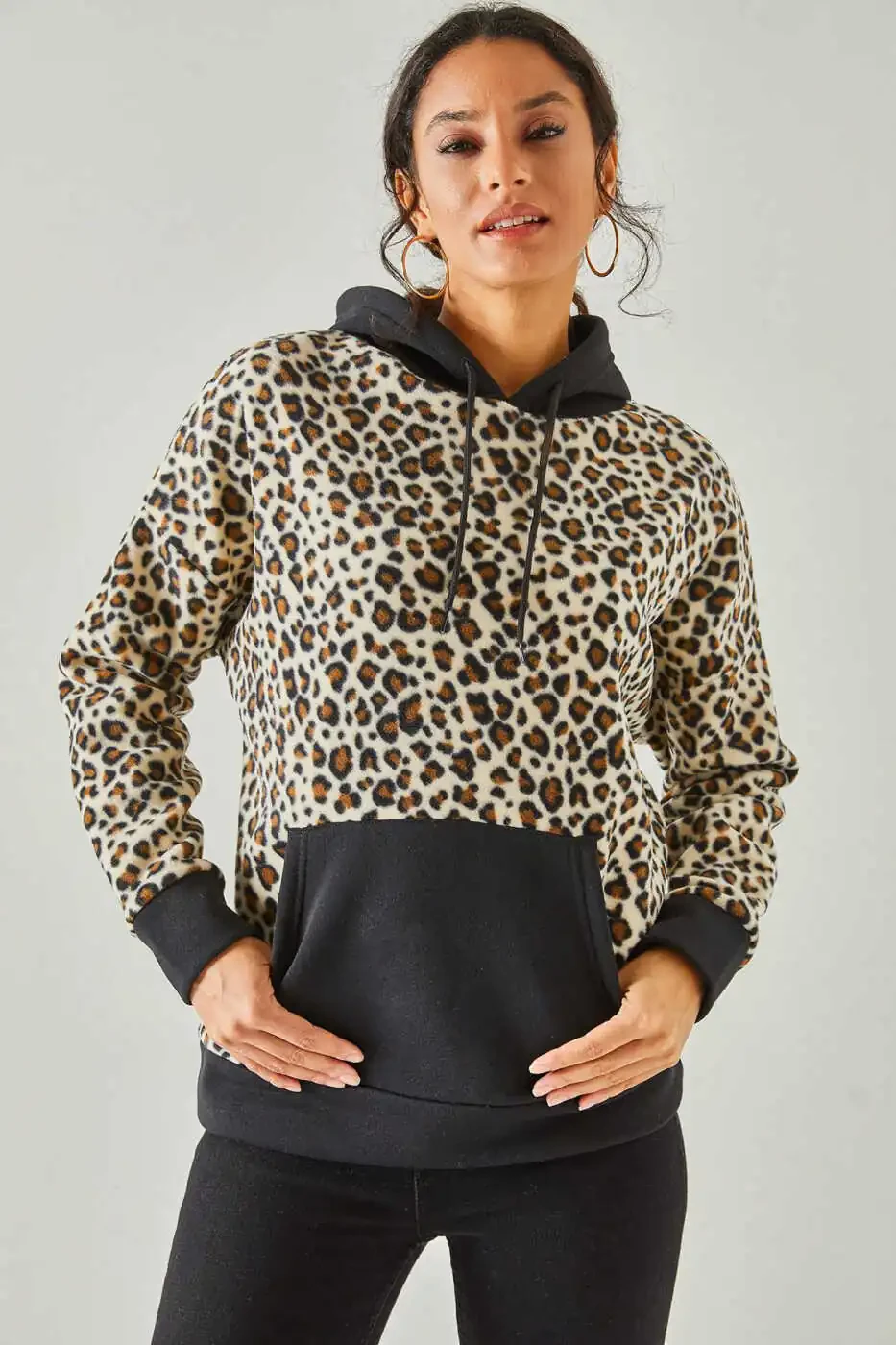 Cozy and Chic: Stay Warm with Our Ecru Leopard Hooded Polar Sweatshirt