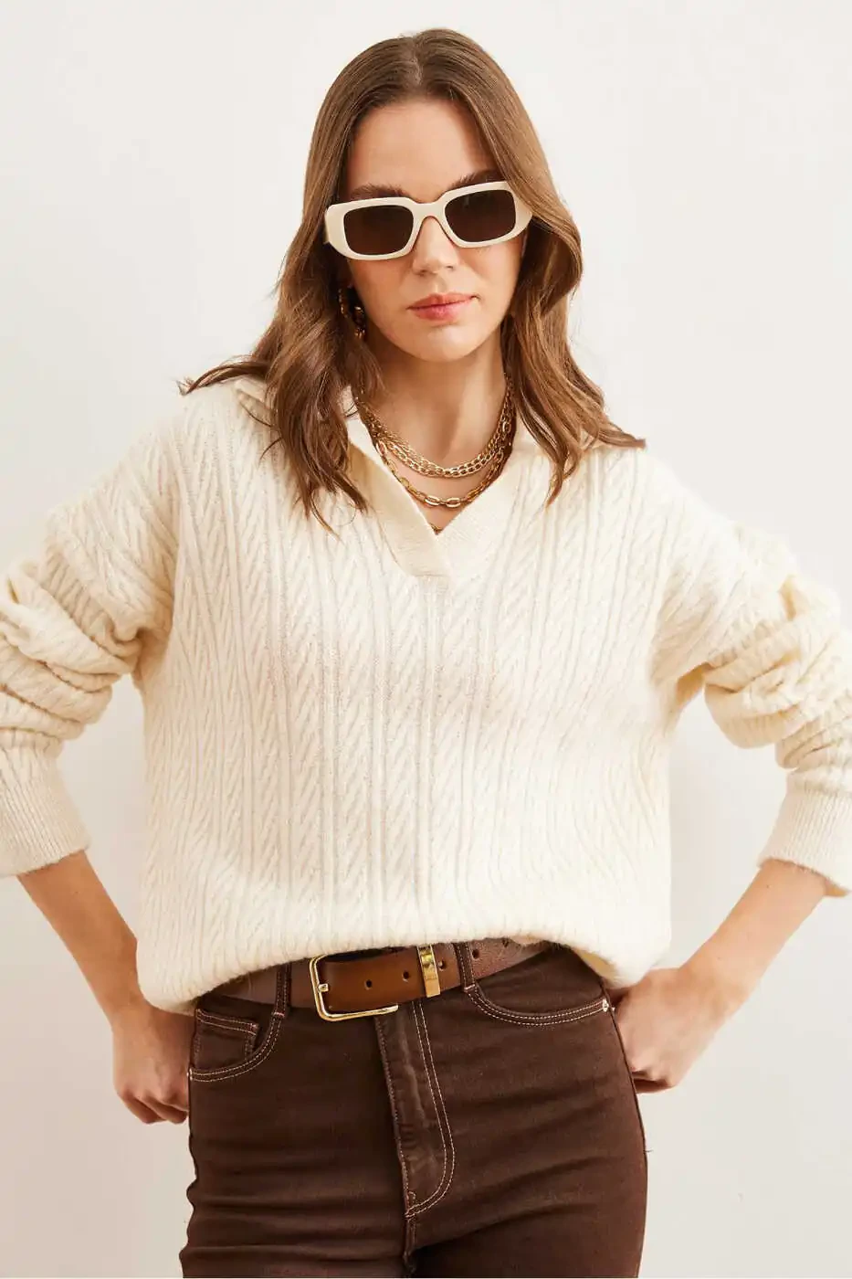 Women's Knit Sweater, Ecru Knit Sweater, Polo Neck Sweater, Cable Knit Sweater, Stylish Sweater, Comfortable Sweater