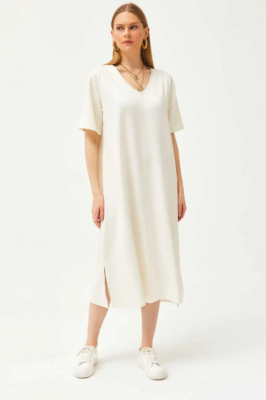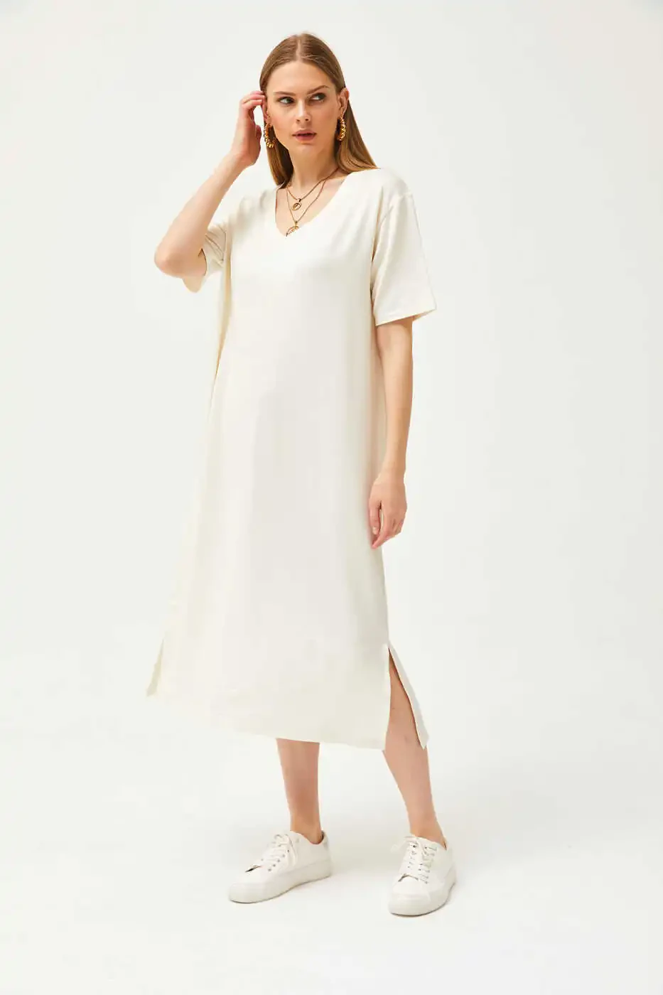 The Ecru V-Neck Side Slit Soft Textured Dress is the perfect choice for women who are looking for both style and comfort. This dress, which will be an indispensable part of your wardrobe, offers comfort all day long with its soft texture. Its elegant V-neck and side slit details add a touch of elegance to your style.