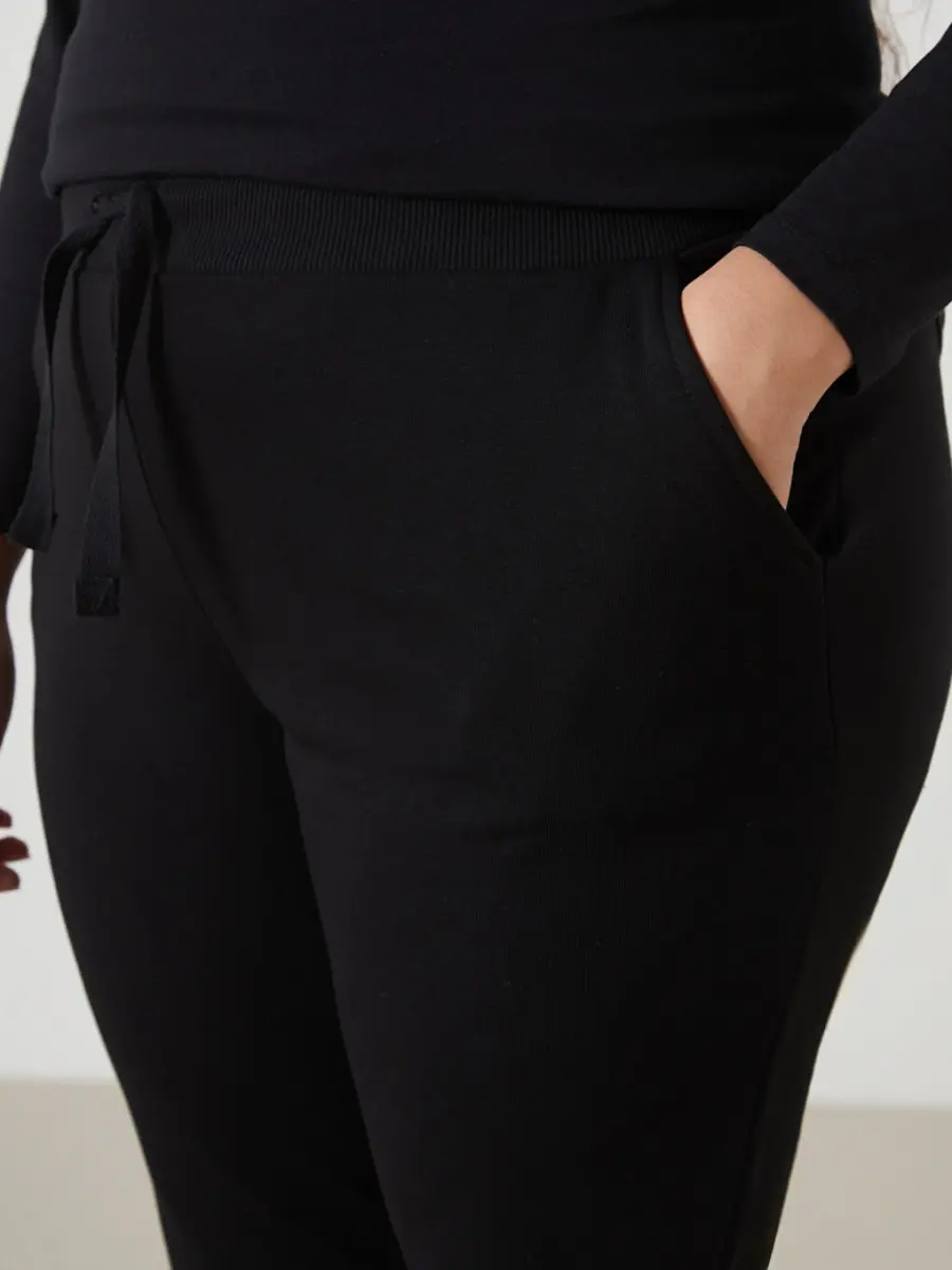 Women's Elastic Waist Plain Jogger Sweatpants - Black are the perfect choice that combines comfort and elegance. Made from cotton-blend 3-thread fabric, these jogger sweatpants offer all-day comfort while keeping you looking stylish. The elasticated waistband and ribbed detailing at the cuffs fit your body perfectly and do not restrict your freedom of movement. These sweatpants, which you can easily use both while doing sports and in your daily activities, will be an indispensable part of your wardrobe. Thanks to its two useful side pockets, you can safely carry your phone, keys or other small items. Its black color allows you to create different styles by harmonizing with all kinds of combinations. Whether you want to achieve a dynamic look with sneakers, or create a casual style by combining it with a casual t-shirt. These sweatpants, produced with LCW Vision quality, stand out with their durability and long-lasting use. Thanks to its machine washable feature, it can be easily cleaned and maintained. These jogger sweatpants, suitable for all body types with their plus size option, are an ideal choice for women who do not want to compromise on comfort. Whether you are resting at home or spending an active day outside, these sweatpants will always accompany you. This product, which offers style and comfort together, is a candidate to be one of the basic pieces of your wardrobe. The quality of its fabric and the care in its stitching details offer long-term use, while its modern design always ensures you look trendy. Enjoy both comfort and elegance with the Women's Elastic Waist Plain Jogger Sweatpants - Black.