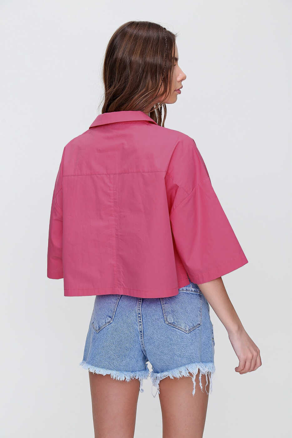 Combining style and comfort, the women's fuchsia envelope pocket crop poplin shirt will be the new favorite of your wardrobe. The shirt, which stands out with its elegant fuchsia color and crop cut, provides comfortable use throughout the day thanks to the breathable structure of the poplin fabric. The envelope pocket detail provides both a stylish look and practical use.