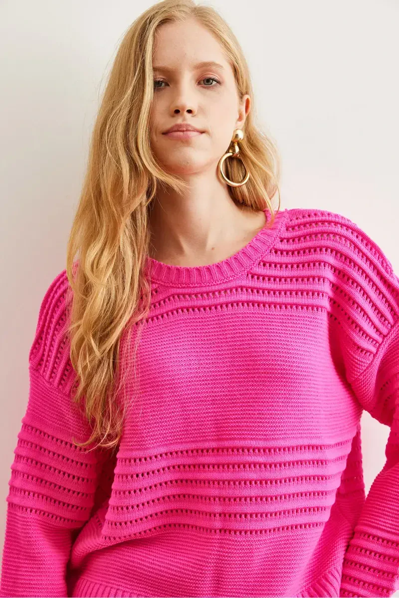 The Women's Fuchsia Textured Striped Knit Sweater KZK-19000808-Fuchsia, offered by Olalook Official, is a special design that combines elegance and comfort. With the vibrancy of the fuchsia color, textured knit pattern, and stripe details, this knit sweater will be an indispensable part of your wardrobe. Made of 100% acrylic material, it offers comfortable use all day long thanks to its soft texture. Designed as a standard size, this sweater is a suitable option for different body types, allowing everyone to wear it comfortably. The product is offered for sale at a campaign price and is available in limited stock. If you want to own this stylish and eye-catching sweater, we recommend you hurry.This knit sweater stands out not only with its stylish appearance but also with its ease of use. You can easily use it in your daily combinations, as well as a piece that will complement your elegance on special occasions. You can create different styles by combining it with jeans, skirts, or tights. The energy of the fuchsia color will add vitality to each of your combinations and make you stand out in any environment. The textured knit pattern of the product adds a different dimension to the sweater, while the stripe details add a modern and dynamic touch.This knit sweater, produced with Olalook Official quality, is carefully designed for long-lasting use. Thanks to its acrylic material, it is easy to clean and does not require ironing. This saves you time and ensures that you always look well-groomed. The standard size means that women with different body sizes can easily choose it, while the stance of the model shows how stylish and elegant the product is. The model is 1.75 tall, chest size 78, waist size 58, and hip size 89, and the standard size on it successfully reflects the general proportions of the product. This information is important in terms of giving you an idea of how the product might look on you.Women's Fuchsia Textured Striped Knit Sweater KZK-19000808-Fuchsia is an ideal option for both daily use and special occasions. By adding this sweater, which combines elegance, comfort, and ease of use, to your wardrobe, you can take your style one step further. This product, offered with Olalook Official assurance, combines quality with an affordable price.