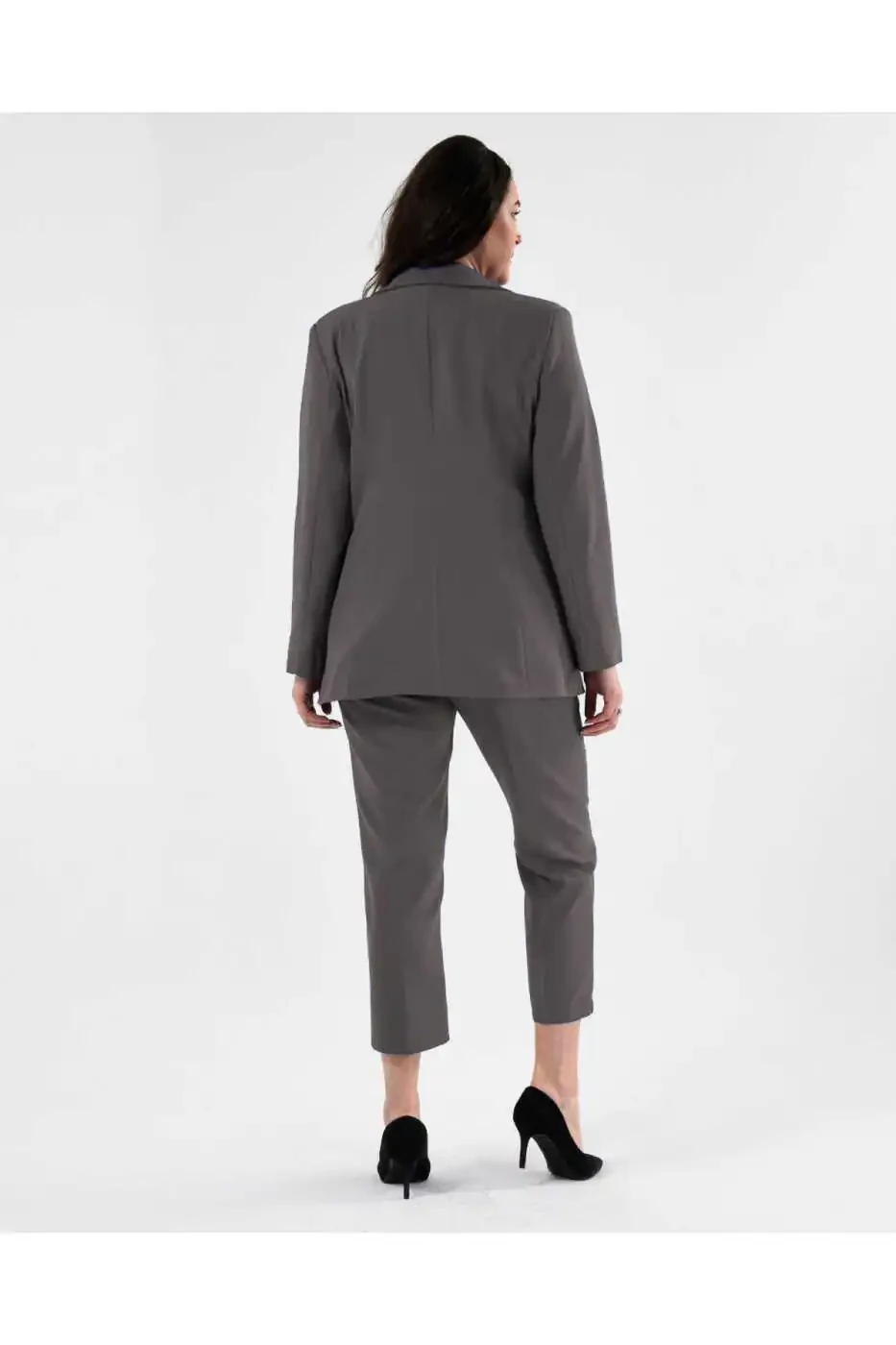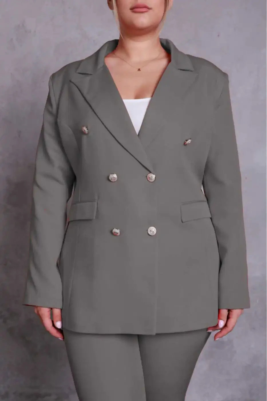 This suit combines style and comfort, making it a must-have for every woman's wardrobe. The grey blazer jacket completes your style with its classic cut and elegant buttons. The belted pocket straight leg trousers offer a stylish and comfortable look. Available in plus sizes, this suit will suit every body type and help you look stunning in any environment.