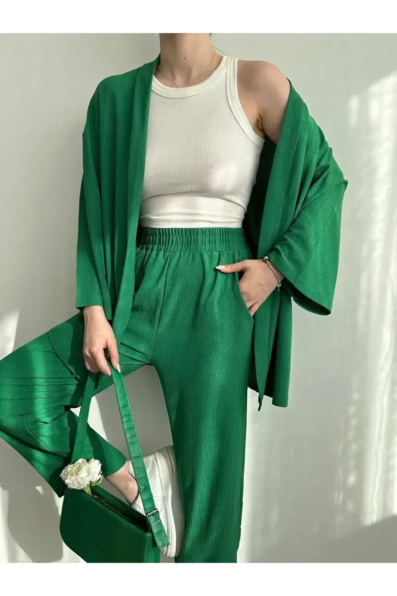 Women's kimono set, green pants set, knitted set, wide leg pants, comfortable and stylish set, daily wear, special occasion combination, acrylic set, women's clothing, kimono pants