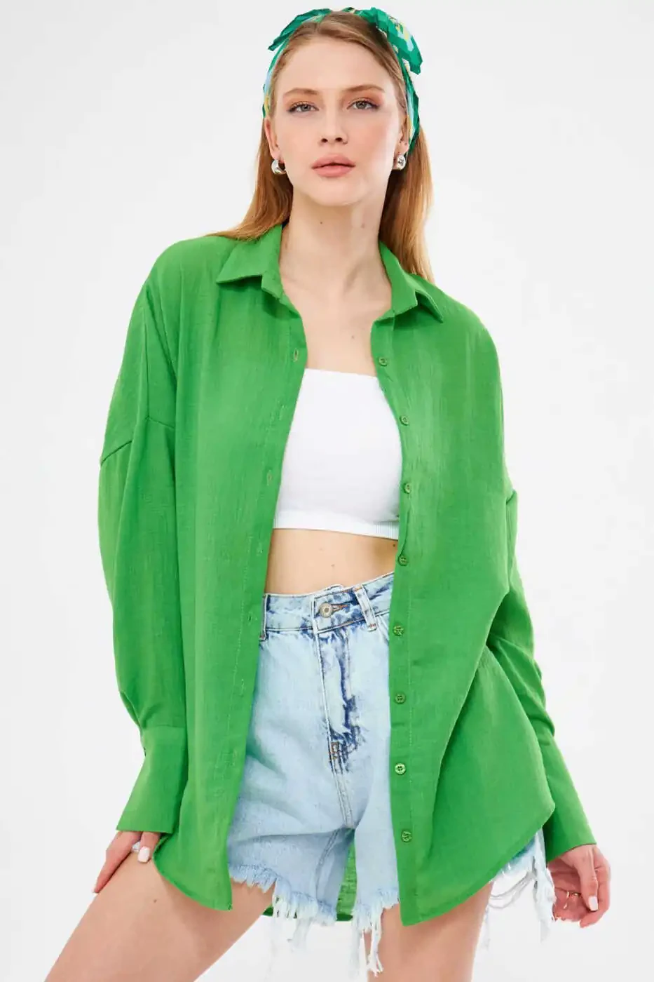 Providing a comfortable fit with its oversized cut, the shirt offers a natural elegance with its textured linen look. Its wide sleeves add both comfort and style. This shirt, with its bright green color, will add color and energy to your outfits of all kinds, helping you stay cool and stylish in the summer months.