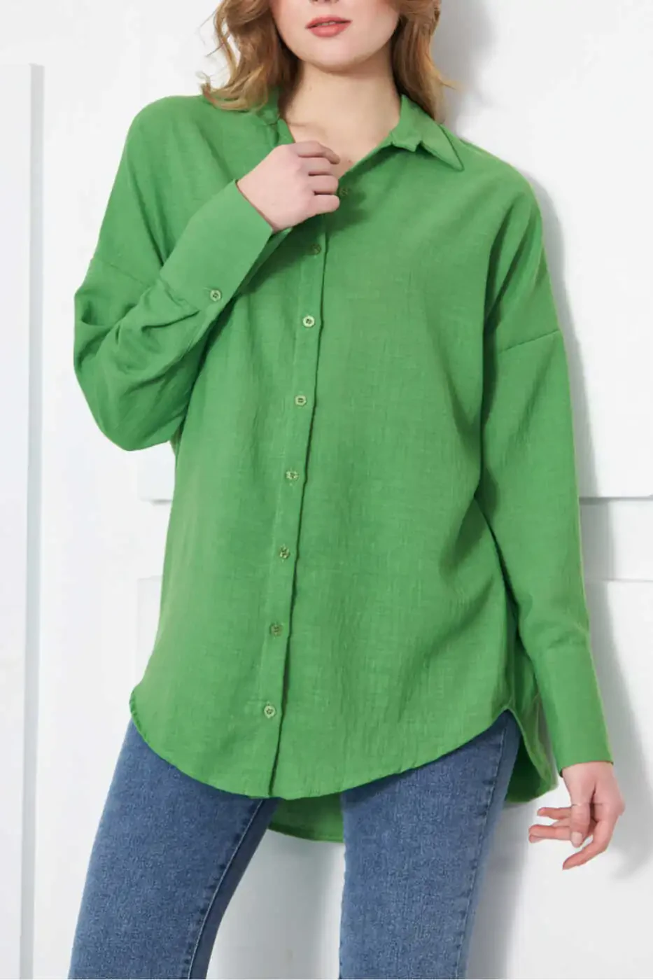 Meet our women's green oversized textured linen look wide sleeve shirt, combining style and comfort! This shirt, an ideal choice for women who want to create a relaxed style in everyday life, stands out with its unique design.