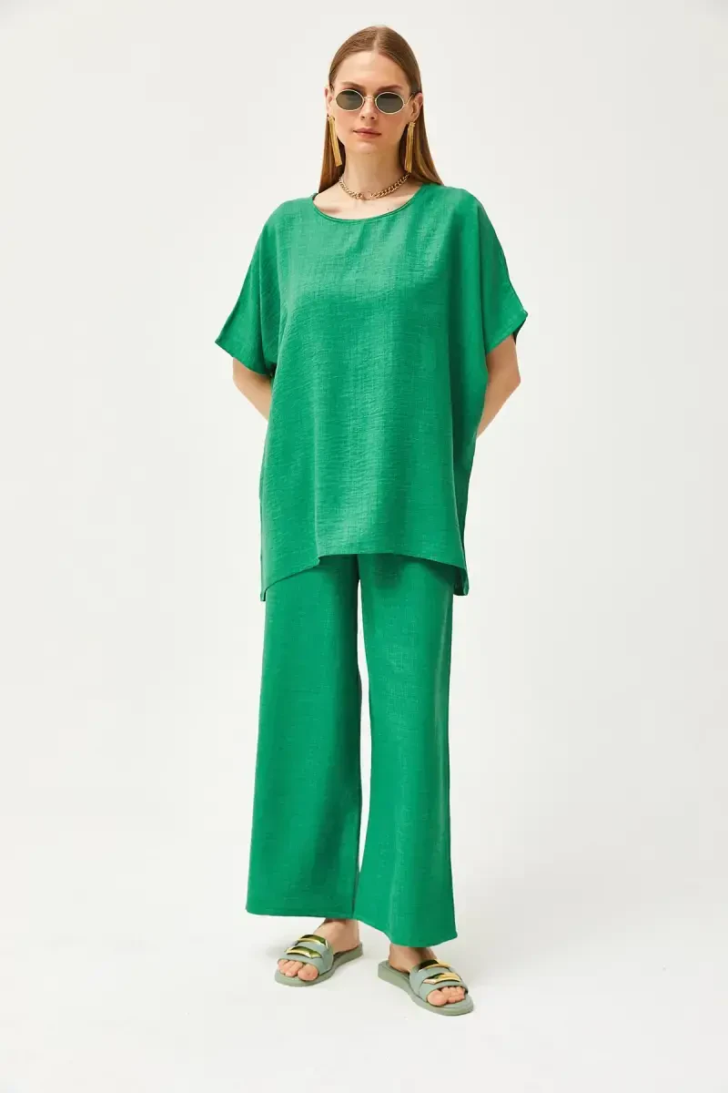 Women's Green Oversized Blouse and Bottom Pocketed Palazzo Linen Suit, a candidate to be one of the indispensable pieces of your wardrobe, offering both comfort and elegance together. This special design comes to your door with Trendyol assurance and aims to provide you with a unique experience. This combination, which you can choose for daily use or for a special occasion, will highlight your style. The comfortable cut of the oversized blouse top allows you to look stylish without restricting your freedom of movement, while the pocketed palazzo linen bottom brings both practicality and a modern silhouette.This combination offers all-day comfort thanks to its 50% cotton and 50% linen blend fabric with its breathable structure. Especially in hot weather, it helps your skin to feel comfortable by preventing sweating. The natural and light texture of linen creates a feeling of nothing on you, while the cotton content provides softness and durability. Thanks to its wide size scale that appeals to every age group, you can easily find a suitable option for yourself, regardless of your body type.The normal waist design and narrow leg cut of the palazzo pants create a modern silhouette, while the pocket details offer the convenience of carrying your belongings such as phone and keys. The blouse, designed with a crew neck and standard sleeve type, gives a simple and elegant look. Thanks to its plain pattern, it can be easily combined with different colored and patterned bottoms, so you can use it in harmony with other pieces in your wardrobe.This special combination not only looks stylish but also offers practical use. It is ideal for long-term use with proper care according to washing instructions. While the linen material gives a light and natural feeling, the woven fabric increases durability. If you want to have both a stylish and comfortable option in your wardrobe, don't miss the Women's Green Oversized Blouse and Bottom Pocketed Palazzo Linen Suit! Reflect your style and enjoy comfort with this unique opportunity offered by Trendyol. Moreover, you can have a risk-free shopping experience with a free return option within 15 days if you are not satisfied. You can visit Trendyol's return policy page for detailed information. This combination will be a perfect choice for you that combines both elegance and comfort.