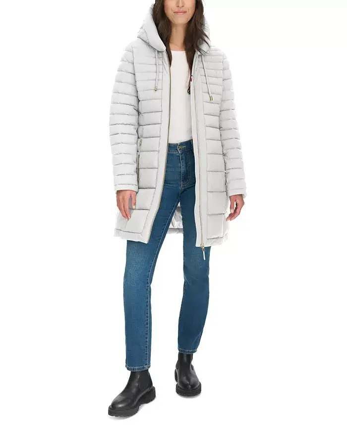 Tommy Hilfiger's cozy puffer coat is designed with an attached hood and two zip pockets so you can stash your stuff on the go. Approx. 34" long from center back to hem Attached hood; front zip closure Two side zip pockets Water resistant Lined Created for Modazone Shell, lining & fill: polyester Machine wash Imported