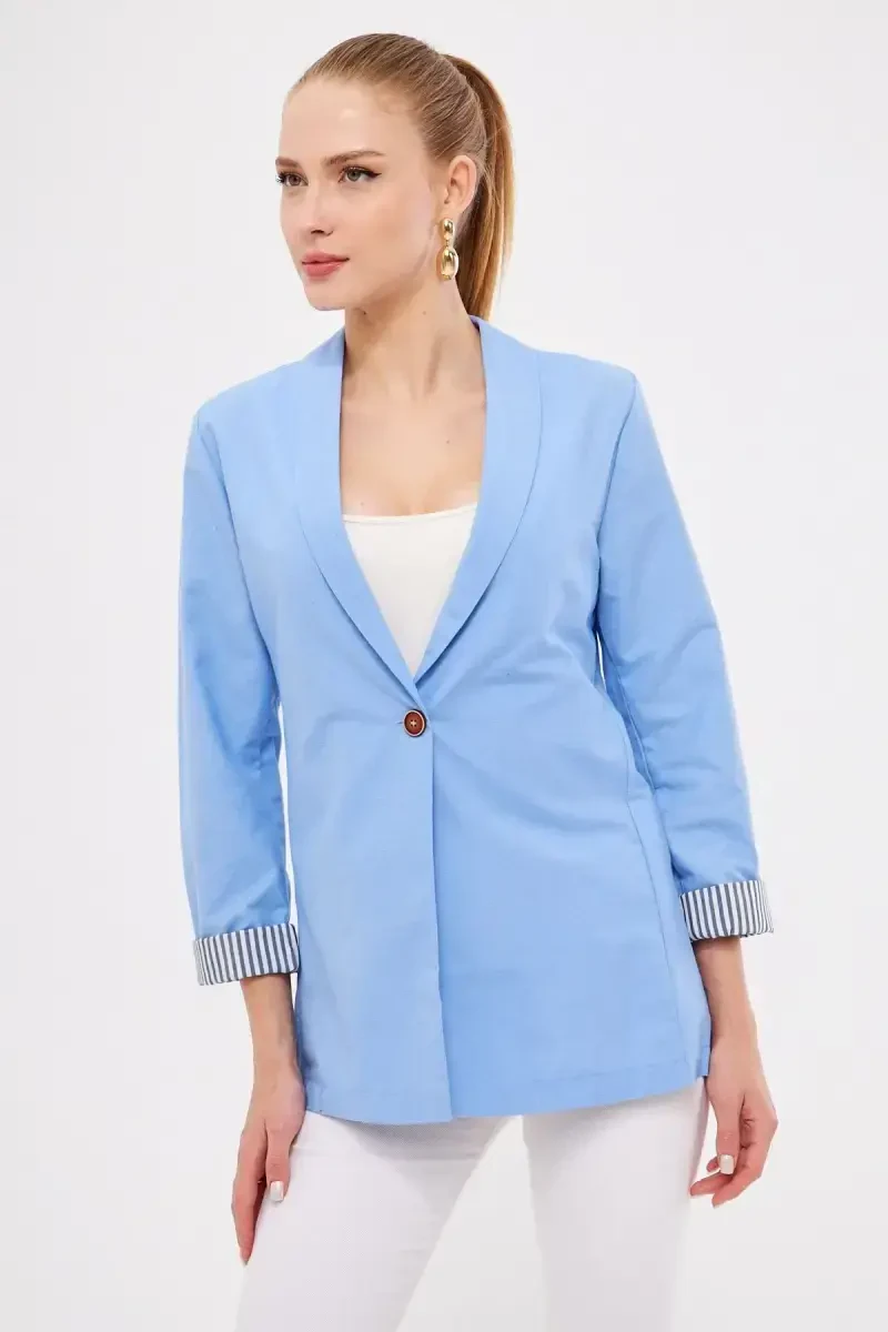 Armonika Women's Ice Blue Single Button Blazer with Striped Inner Sleeve is a special design that combines elegance and comfort. This blazer, which attracts attention with its ice blue color, offers a lively and modern look with the striped details inside the sleeve. The single button detail emphasizes the elegant cut of the jacket and adds a different touch to your outfit. Ideal for both daily use and special occasions, this blazer is a candidate to be one of the indispensable pieces of your wardrobe. Armonika offers an option to complete women's style with this blazer. The modern and stylish design of the blazer allows you to create different combinations. You can combine it with trousers and a blouse for a classic look, or with jeans and a t-shirt for a more casual style. This blazer, which will highlight your elegance in every situation, easily adapts to other pieces in your wardrobe. This special design blazer is made of high quality materials. The mixture of 50% cotton and 50% polyester ensures that the blazer is both durable and comfortable. The cotton fabric allows your skin to breathe, while the polyester fabric maintains the blazer's shape and makes it resistant to wrinkles. Thanks to this, the blazer is ideal for long-term use and ensures that you always look stylish. Armonika Women's Ice Blue Single Button Blazer with Striped Inner Sleeve is not only stylish, but also a functional piece of clothing. The single button detail allows the blazer to be easily opened and closed, while the striped details inside the sleeve add a dynamic touch to the blazer. The cut of the blazer fits perfectly on the body and creates an elegant silhouette. In this way, it adapts to every body and makes the wearer look fitter. This special design by Armonika is designed for women to feel special. The ice blue color is suitable for use in all seasons and can be easily combined with different colors. The elegance and comfort of the blazer offer a comfortable use throughout the day. Whether at the office, at an event, or on a daily outing, this blazer always completes your elegance. Armonika Women's Ice Blue Single Button Blazer with Striped Inner Sleeve is an ideal choice for women who are looking for quality and elegance together. This blazer, which will be one of the most special pieces of your wardrobe, will always highlight your style and make you different. This blazer, produced with Armonika's meticulous workmanship and quality materials, will be an investment that you can enjoy for many years.