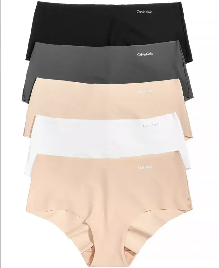 This comfortable hipster from Calvin Klein features seam-free edges for a smooth, line-free look under clothing. Stock up with a convenient 5-pack. Calvin Klein logo at left waist No tag for comfort Lined at gusset Comes in a pack of 5 Light waistband Panty style: hipster Body: 75% nylon, 25% elastane; gusset: 72% nylon 28% elastane Machine wash Imported